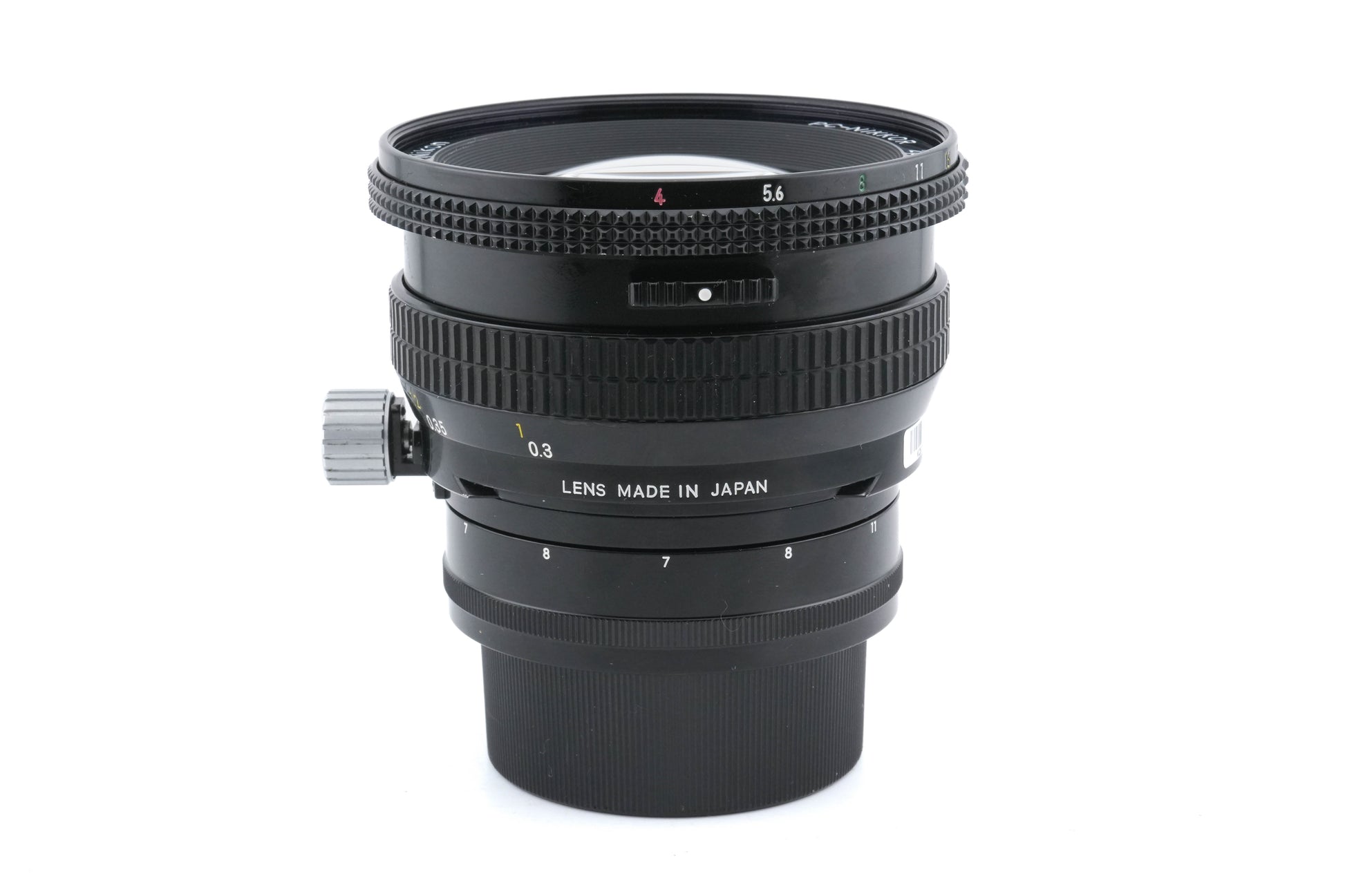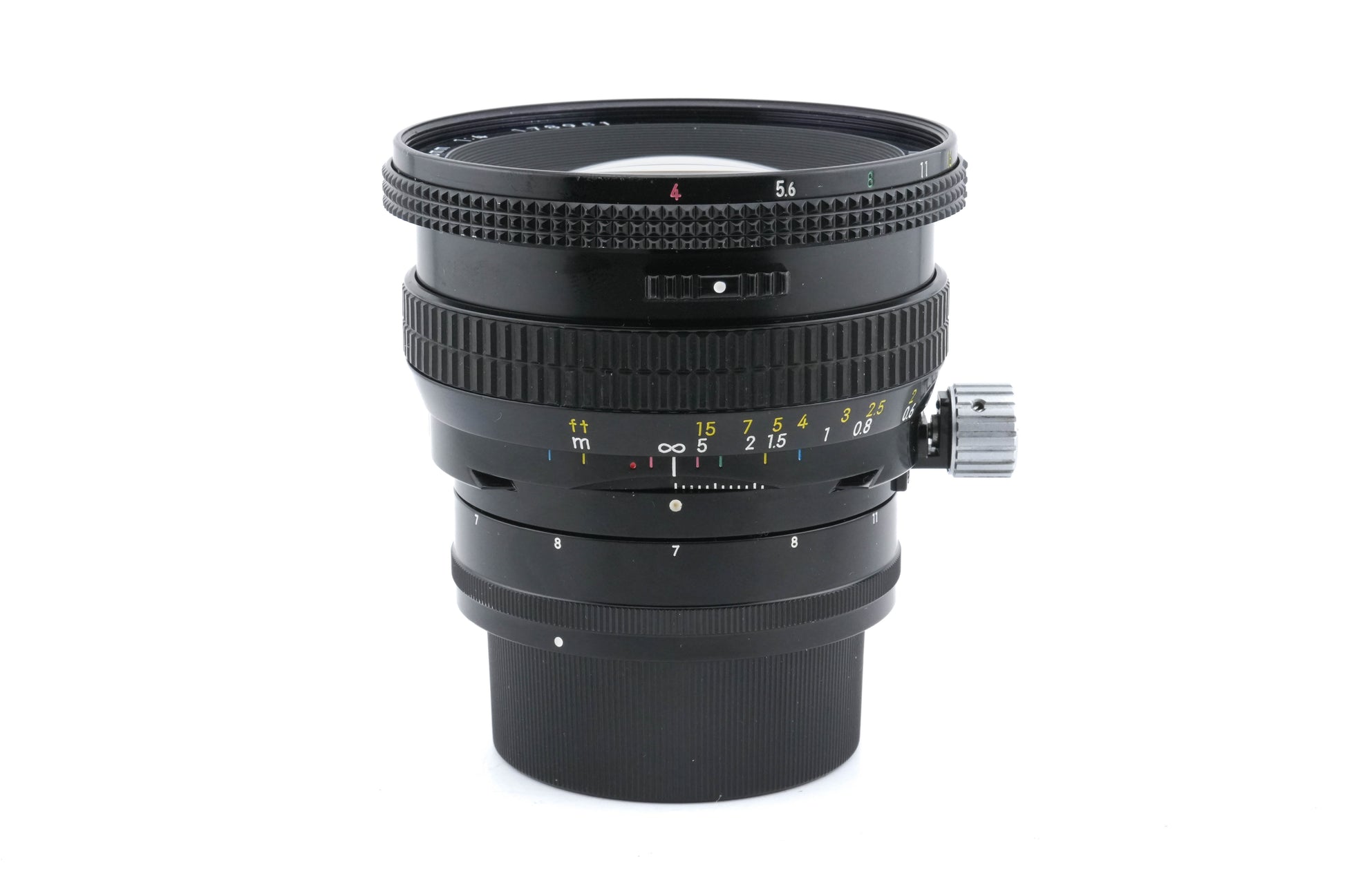 Manual focus wide-angle perspective control lens made for F-mount 35mm SLR cameras introduced by Nikon. It has 11 millimeters of shift in any direction, but 8mm left or right as a limit before a loss in sharpness occurs. It has a preset aperture ring. Metal and plastic body available in black.