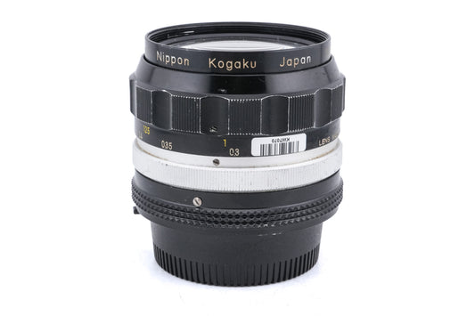 Manual focus normal lens for F-mount 35mm SLR cameras introduced by Nikon in 1966. This one has been modified, either by Nikon or a previous owner, to work with AI cameras. It has the bunny ear metering prongs and AI ridge but not AI-S indent so it will meter properly on all manual Nikon cameras but won't work with the advanced program modes of later models. Metal body, available in black.