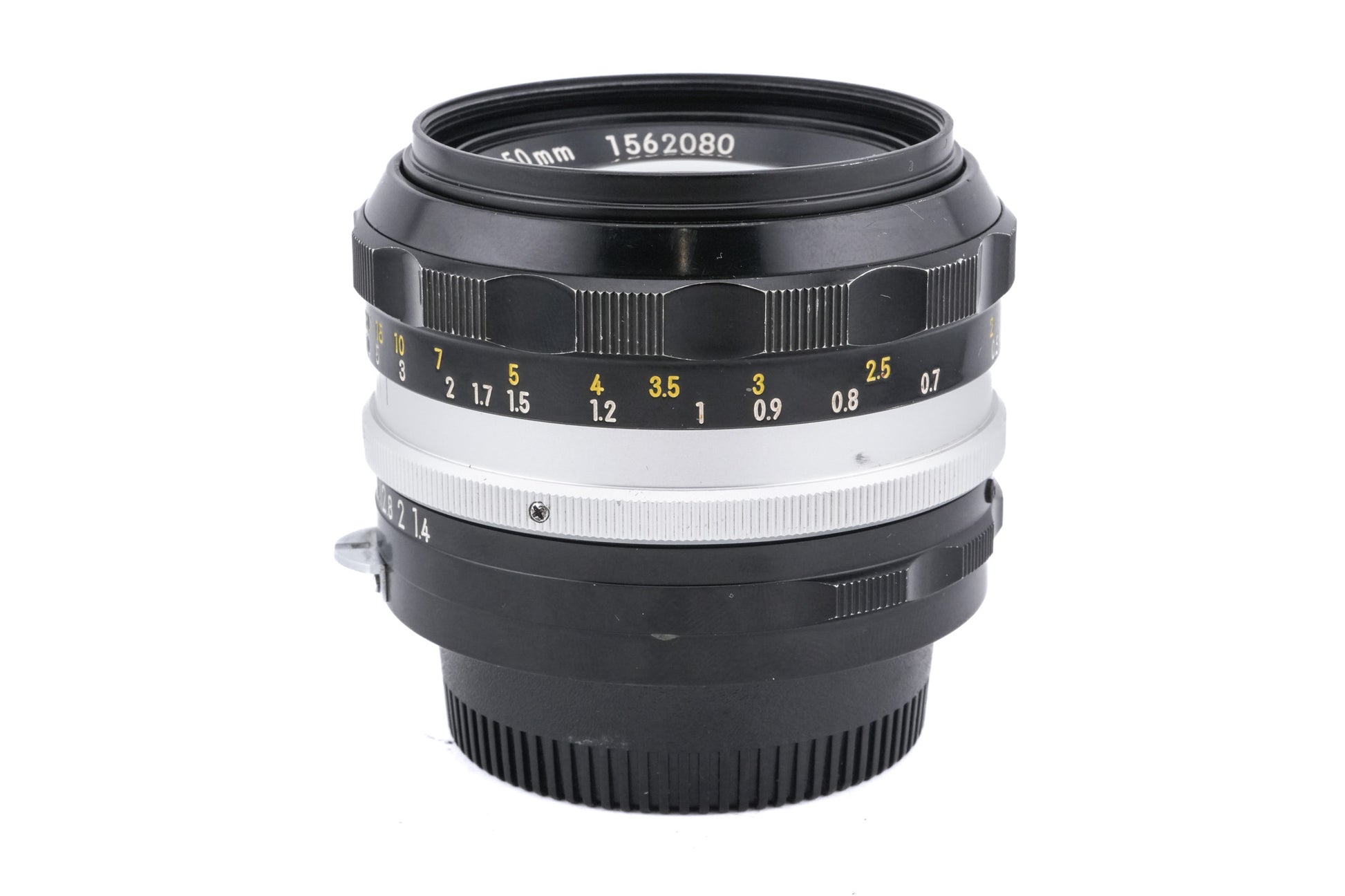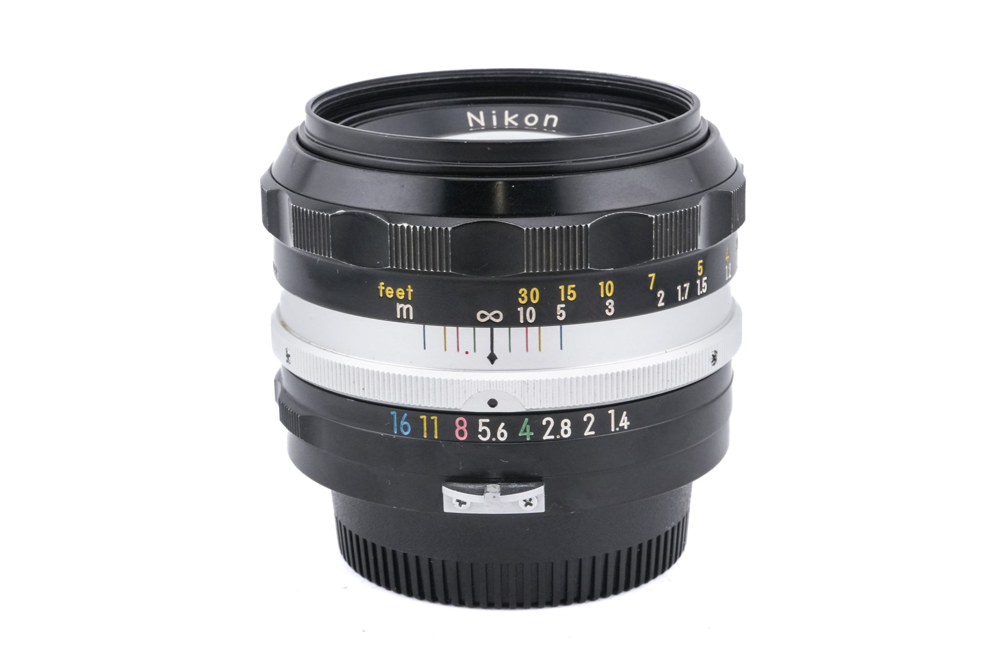 Manual focus normal lens made for F-mount 35mm SLR cameras introduced by Nikon in 1973. This version of the 50mm f1.4 has multicoating (C). It has bunny ear metering prongs but no AI ridge or AI-S indent, so it will only meter properly on older (F, F2, and Nikkormat) F mount SLRs and will not work with the advanced program modes of later models. Metal body available in black/silver.
