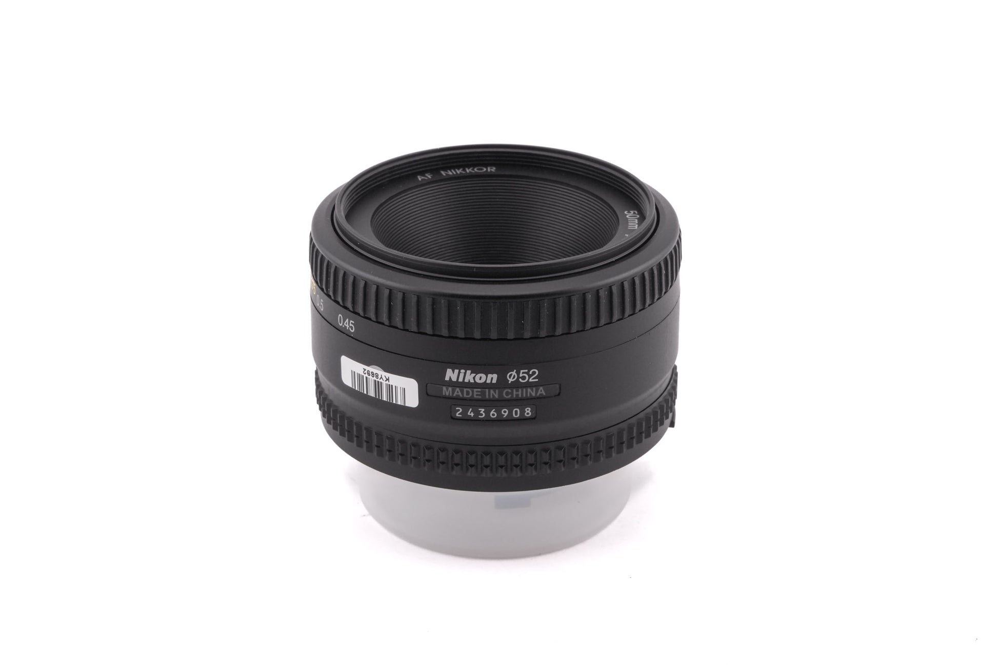 Autofocus normal lens made for F-mount SLR cameras by Nikon. It does not have a built-in focus motor, so autofocus does not work on the cheaper Nikon cameras. Plastic and metal body available in black.