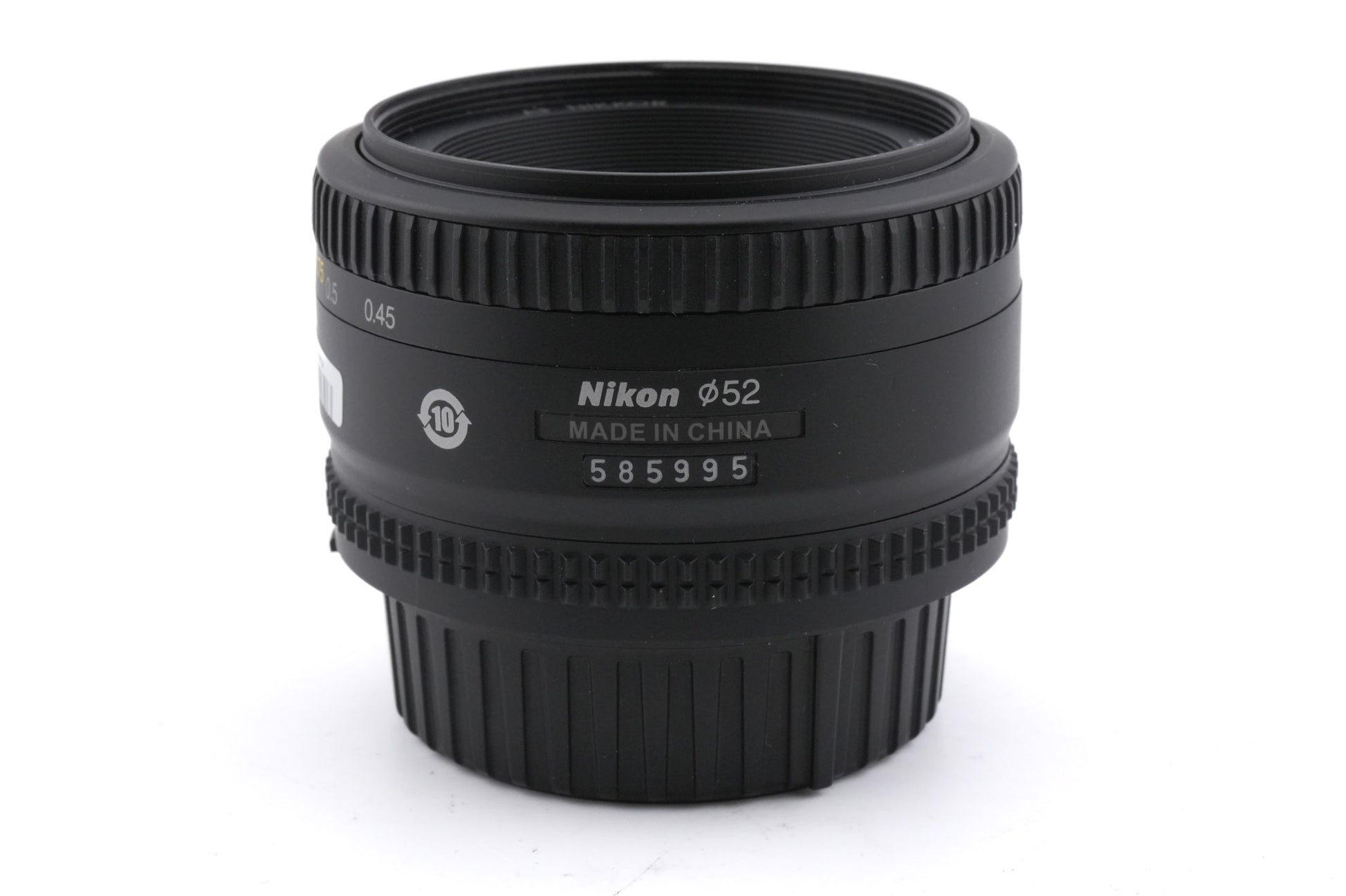 Autofocus normal lens made for F-mount SLR cameras by Nikon. It does not have a built-in focus motor, so autofocus does not work on the cheaper Nikon cameras. Plastic and metal body available in black.