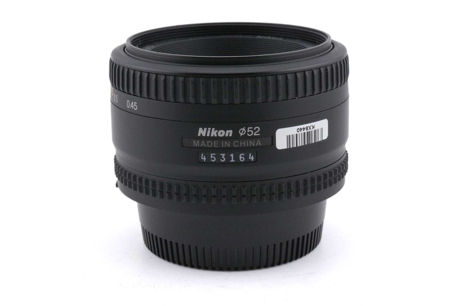 Autofocus normal lens made for F-mount SLR cameras by Nikon. It does not have a built-in focus motor, so autofocus does not work on the cheaper Nikon cameras. Plastic and metal body available in black.
