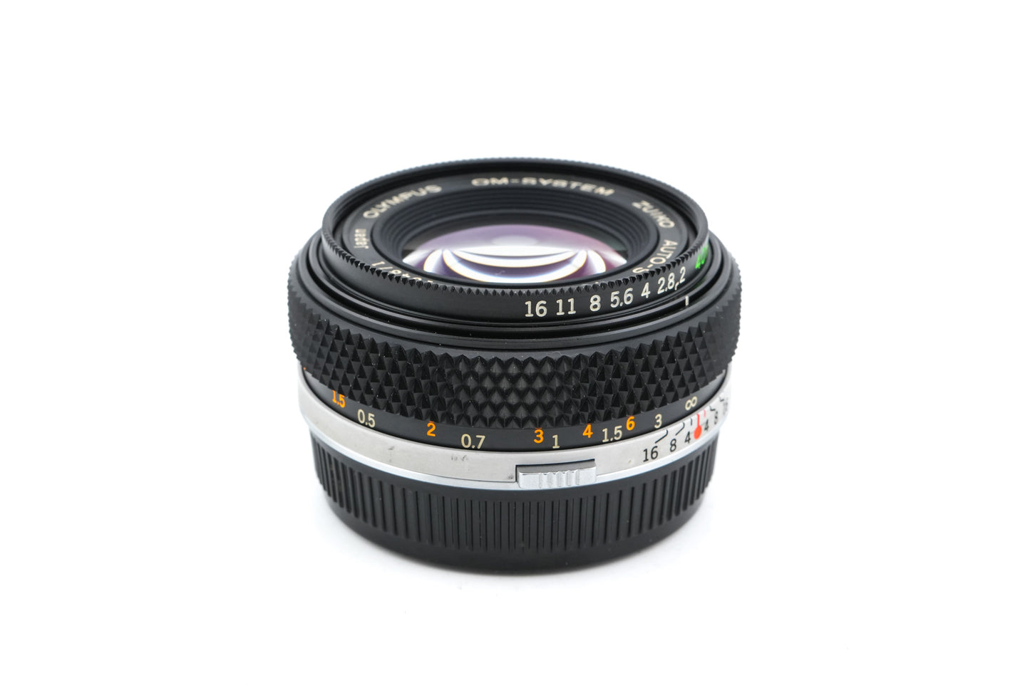 Manual focus normal lens made for OM-mount 35mm SLR cameras by Olympus. Tiny standard lens for the already small OM series Olympus bodies. Metal body available in black and silver.