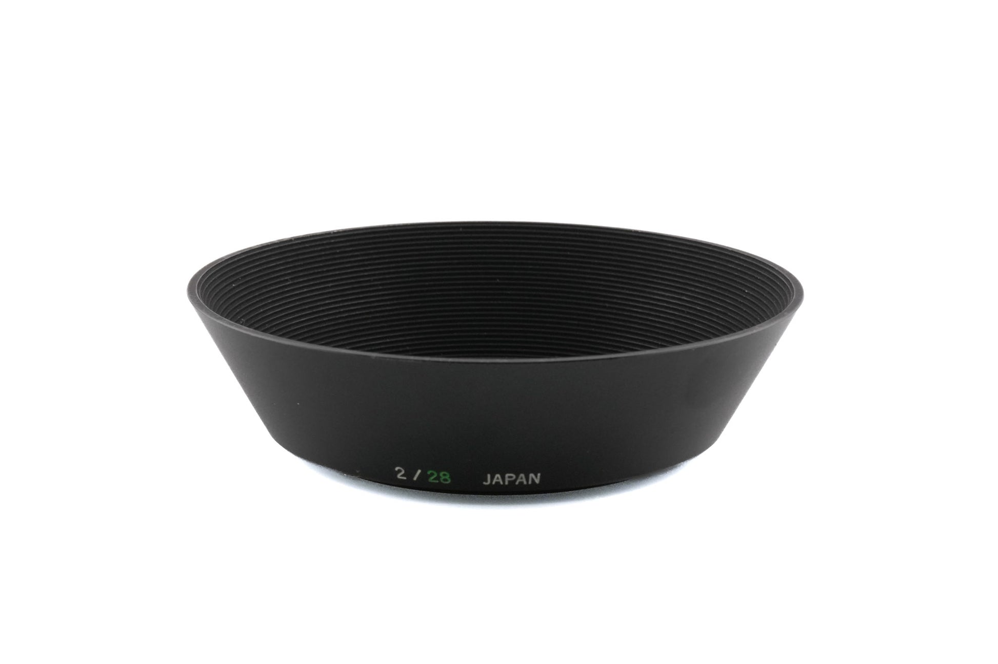 Lens hood made by Olympus for OM mount 28mm f2 Zuiko lenses. Will fit any lens with 49mm filter threads. Blocks errant light from entering the lens, preventing flares and ghosting. Black metal body.