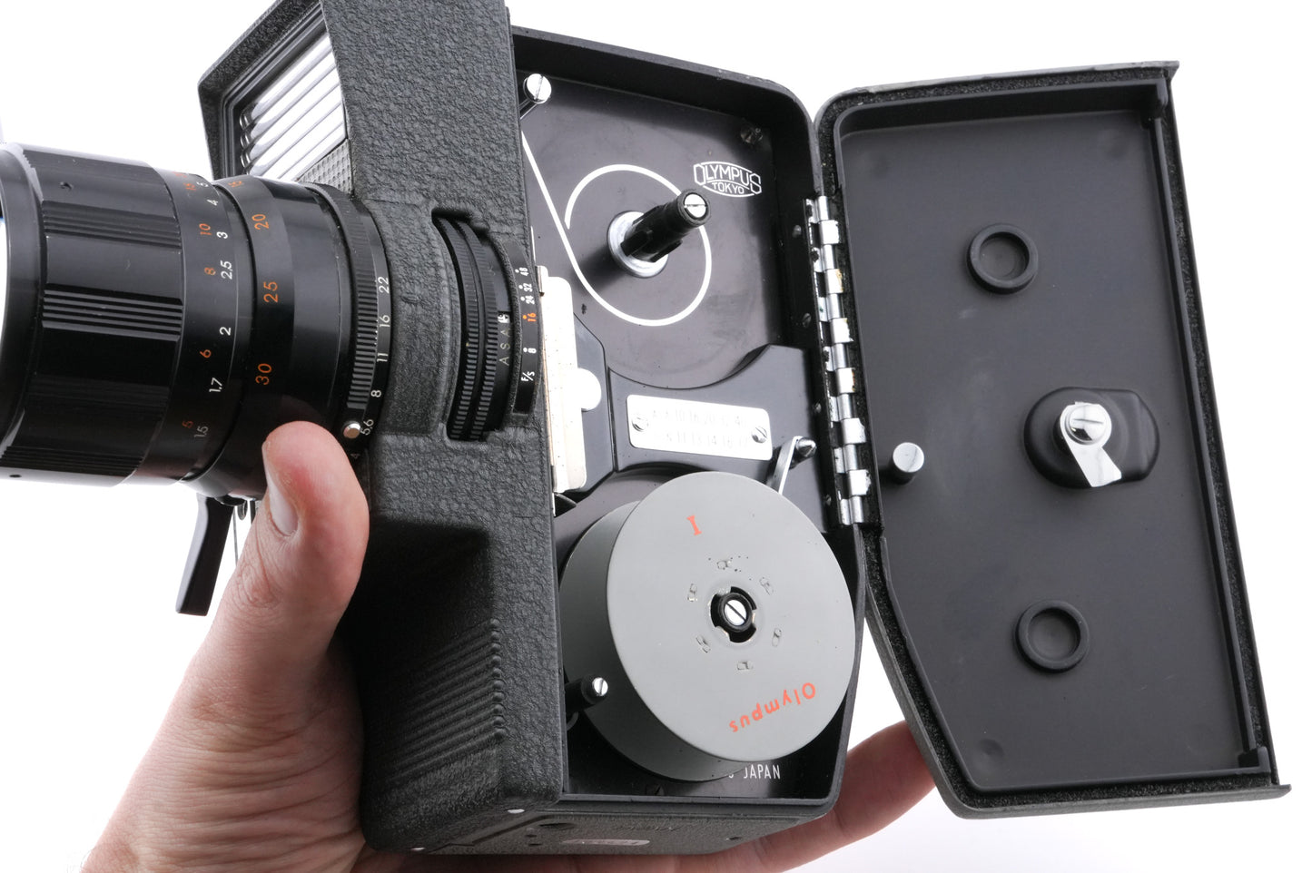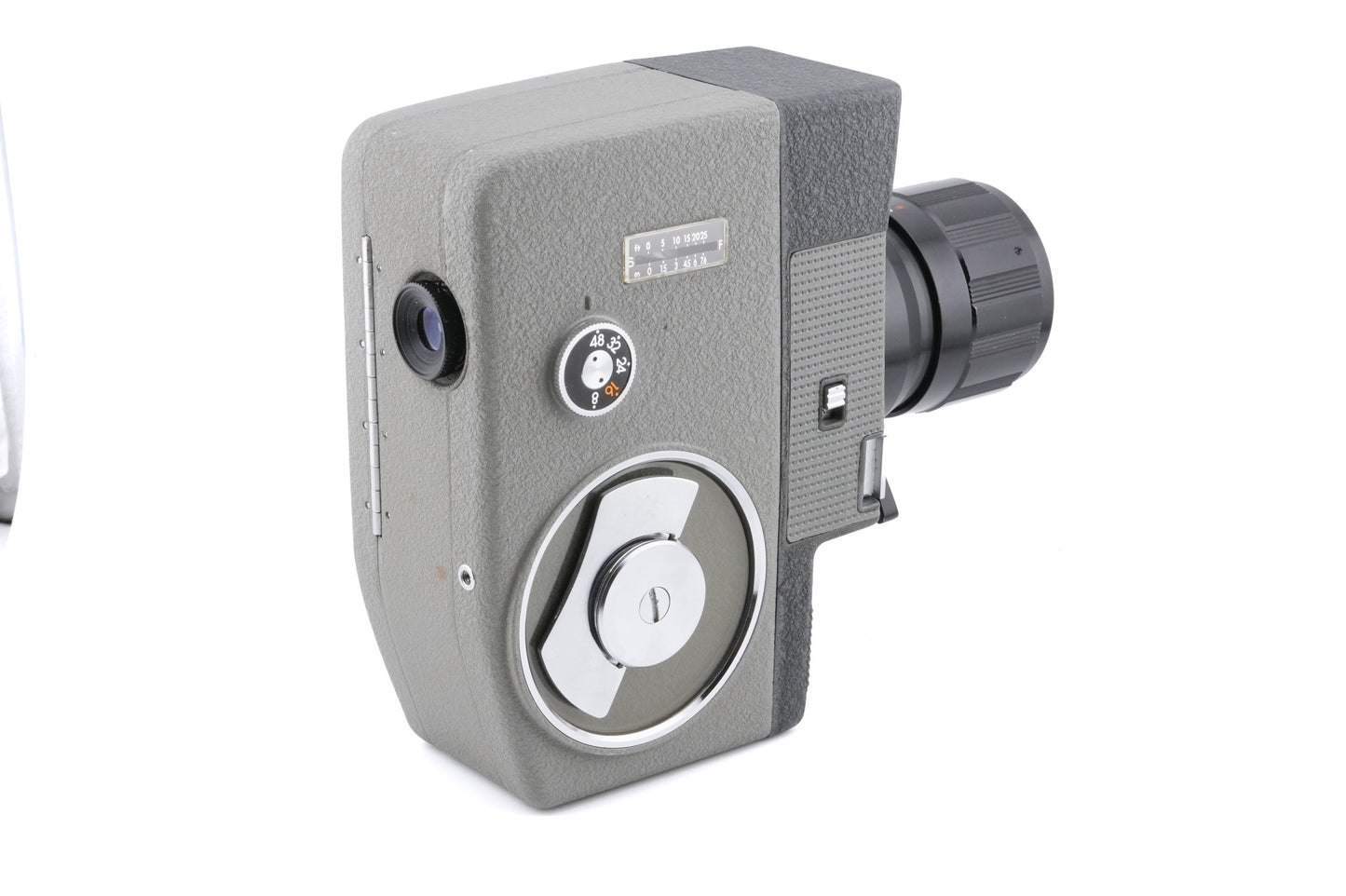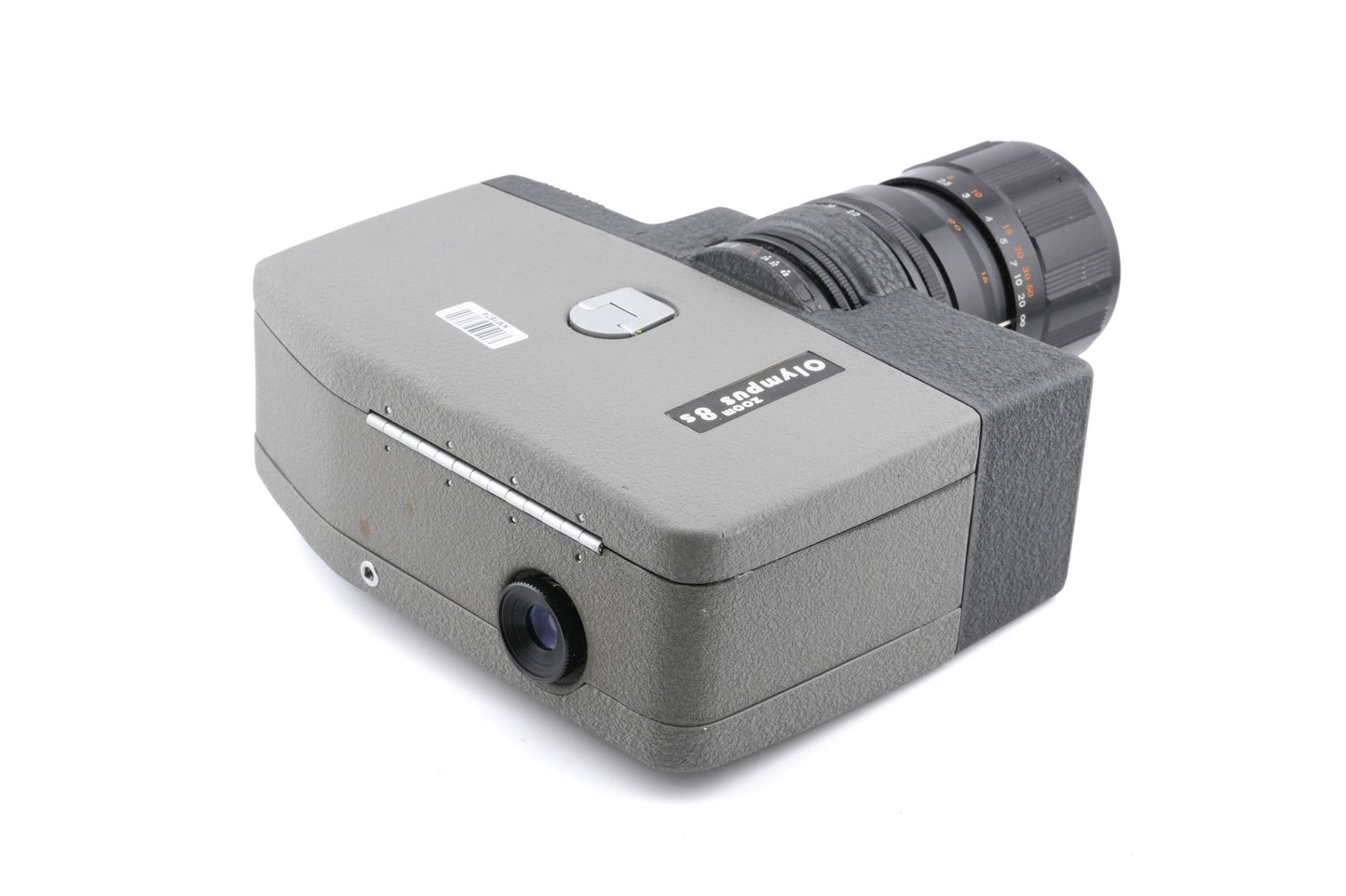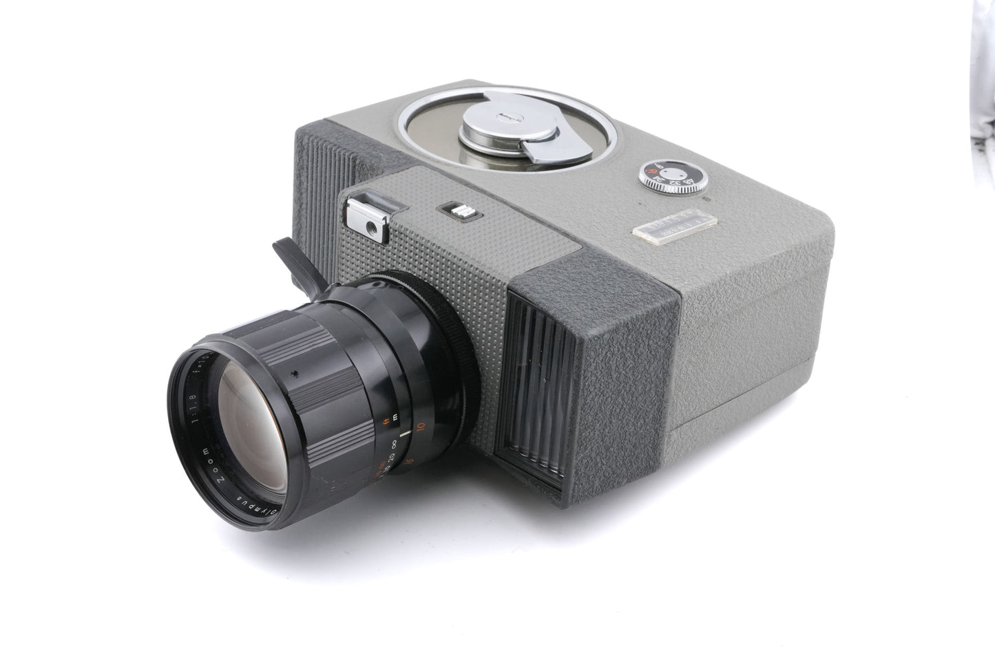 Manual focus 8mm movie camera made by Olympus. Metal body available in gray.