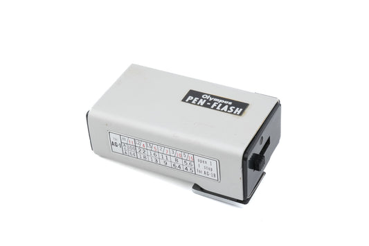 Compact accessory flash for Olympus PEN F 35mm half-frame SLRs. Requires a hot shoe connection to fire and uses AG1 bulbs as well as a model 404 15-volt battery. The CL stands for "cordless".