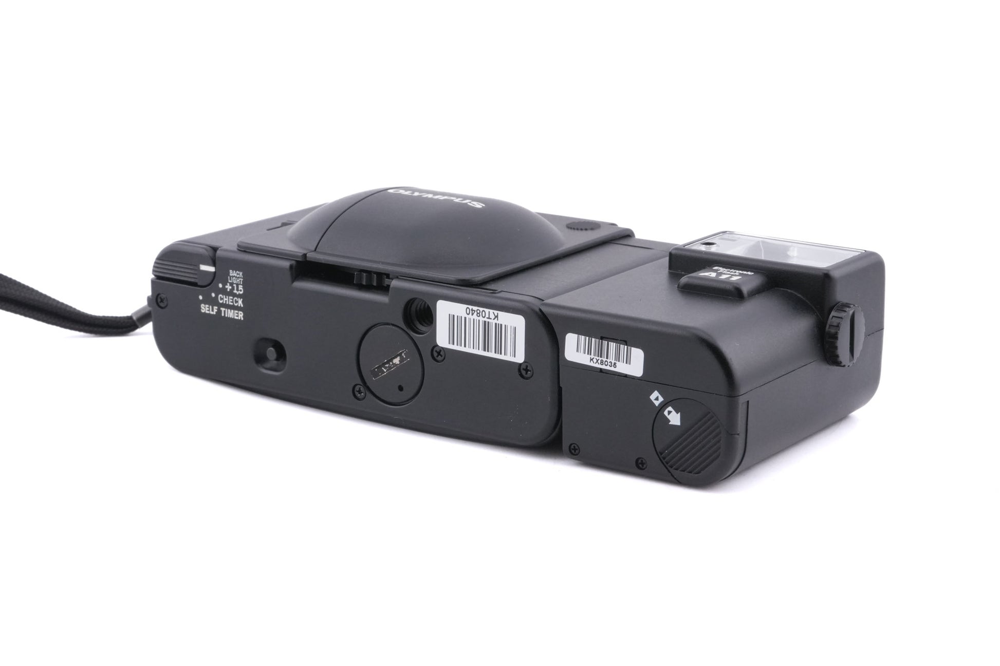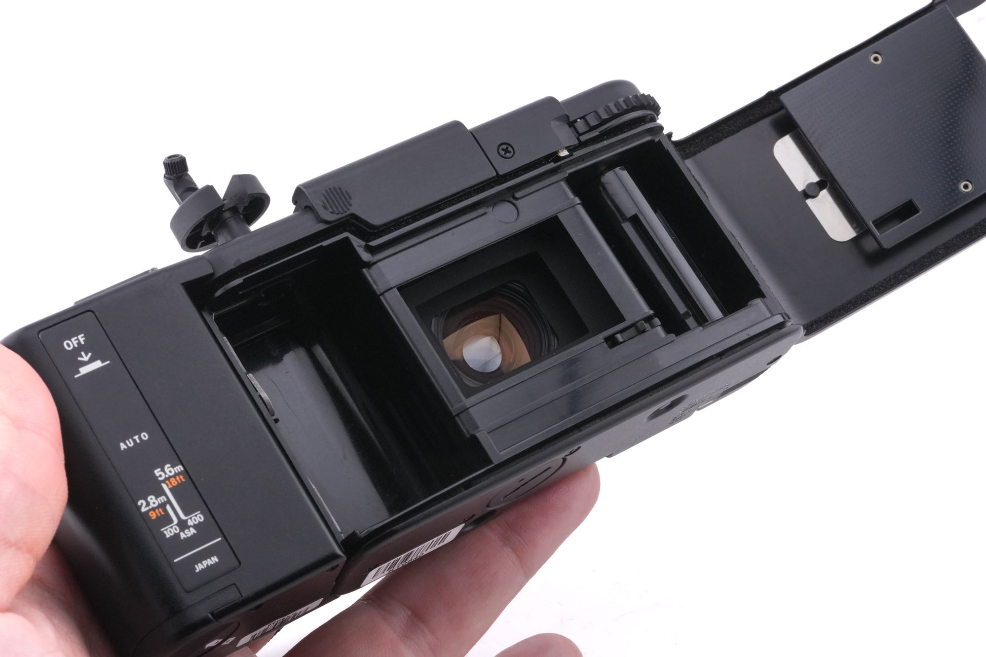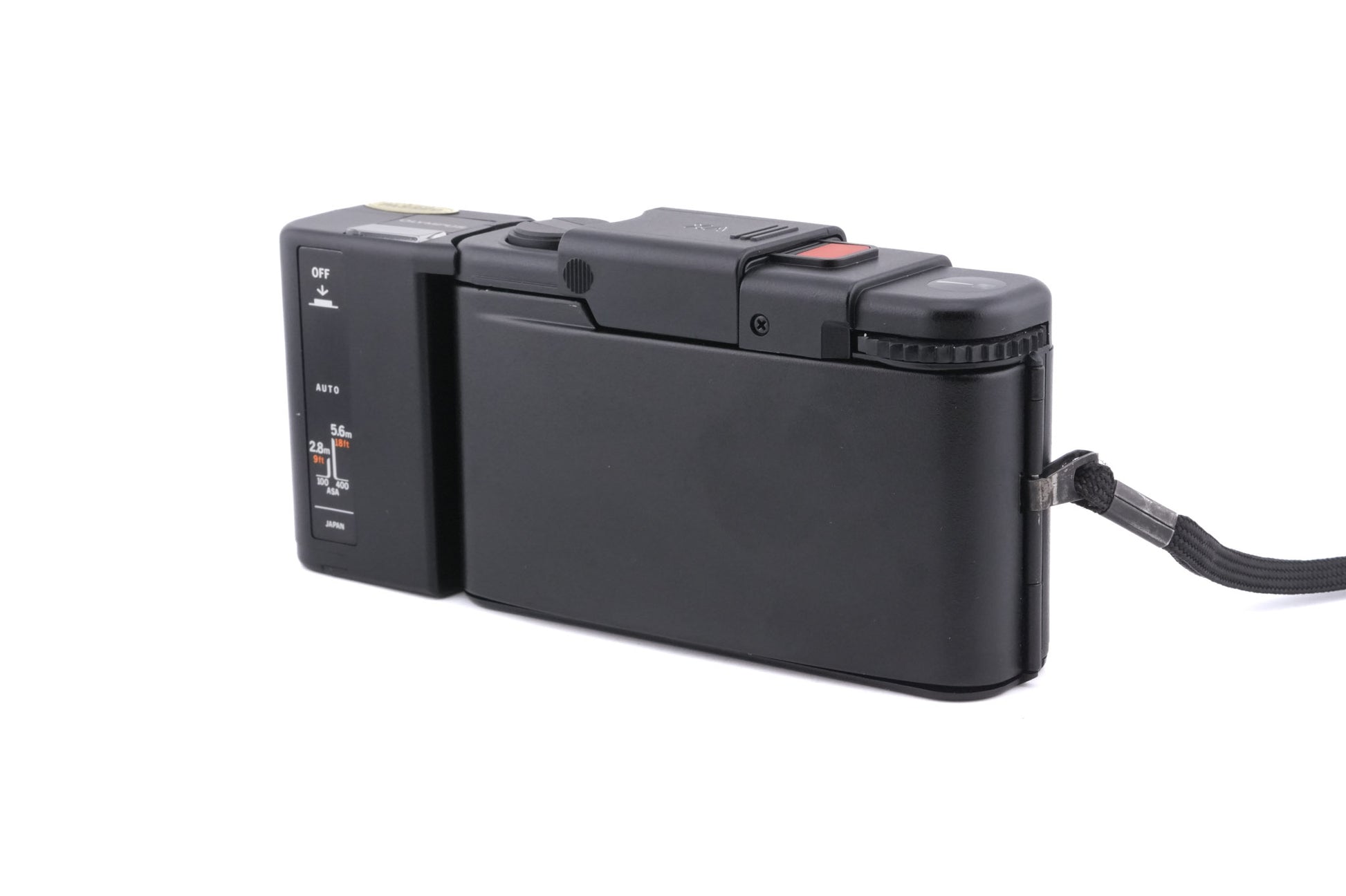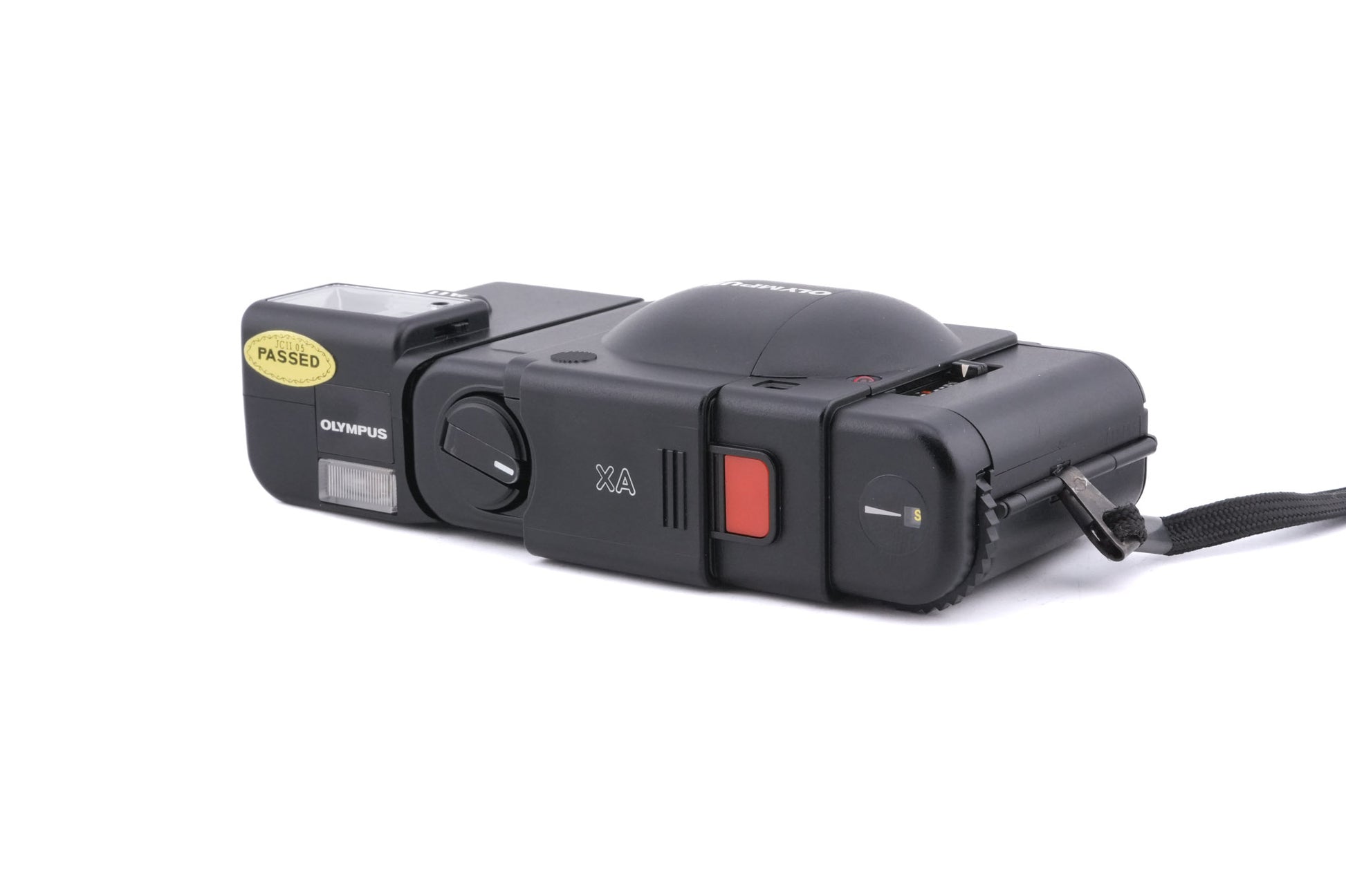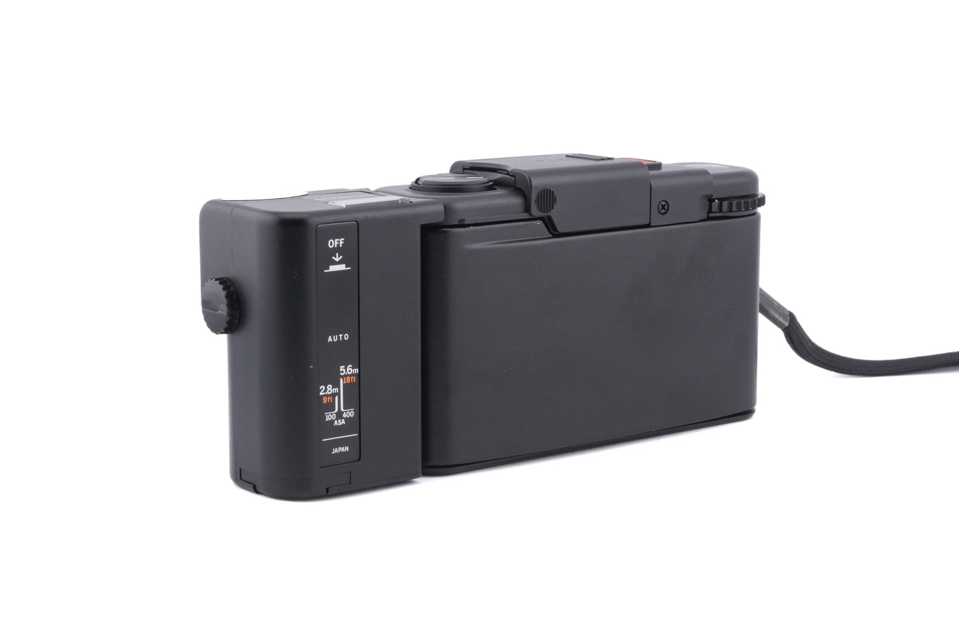 Manual focus 35mm rangefinder camera released by Olympus in 1979. The XA was designed by Yoshihisa Maitani, who also designed the OM-1 SLR. It is capable of aperture priority auto exposure using a built-in CdS light meter. The clamshell lens cover functions as the power switch. A switch on the bottom of the camera allows for backlight compensation (+1.5 stops), battery check, and self-timer. A detachable flash can be attached to the side of the body. Plastic body available in black.