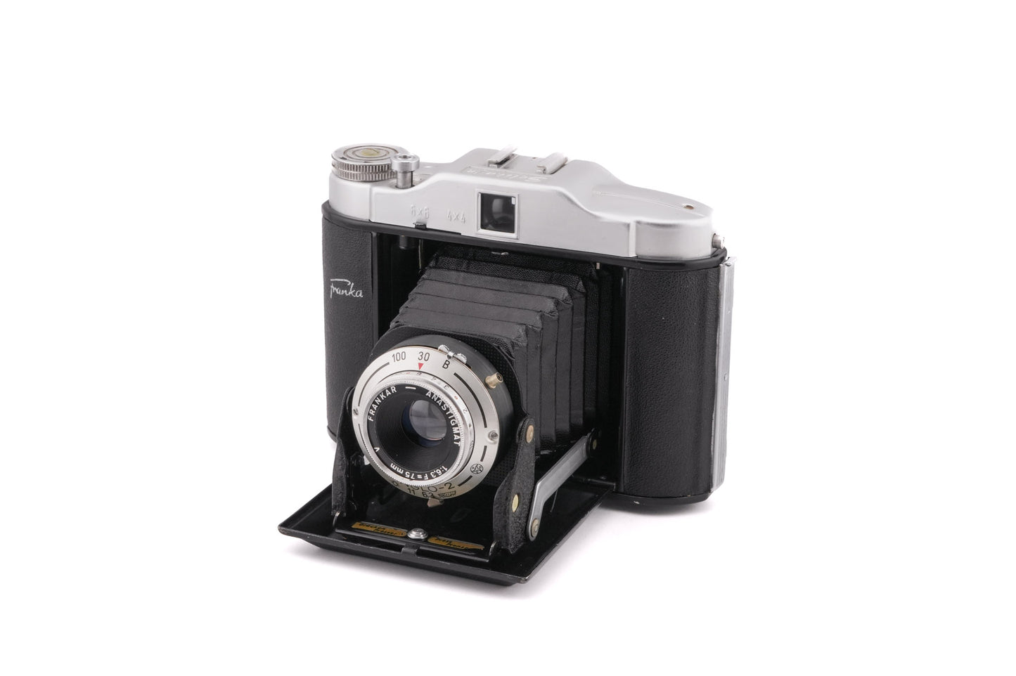 Manual focus folding 6x6 medium format camera introduced by Franka. A few variations in design were made over the years. Metal body available in silver.