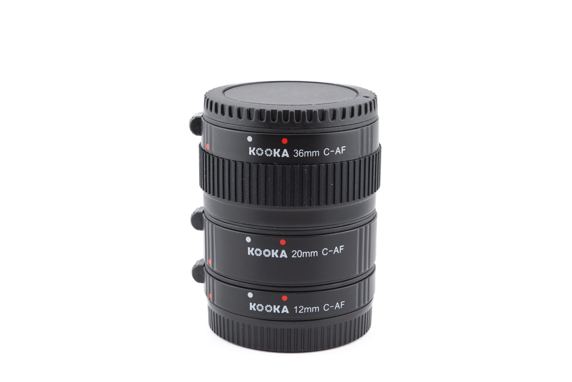 AF extension tubes for Canon EF and EF-S lenses made by Kooka. 12mm, 20mm, and 36mm tubes, that can be used in any combination or individually. Plastic/metal body available in black.