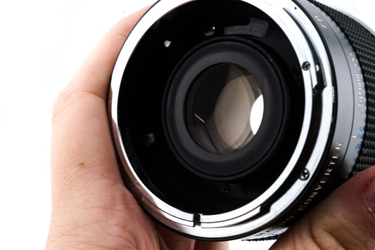 Macro converter made by Panagor for all Canon FD mount 35mm SLRs. Doubles your focal length and allows for 1:1 macro reproduction with 50mm lenses using its own focusing helicoid. Black metal body with silver breech lock.