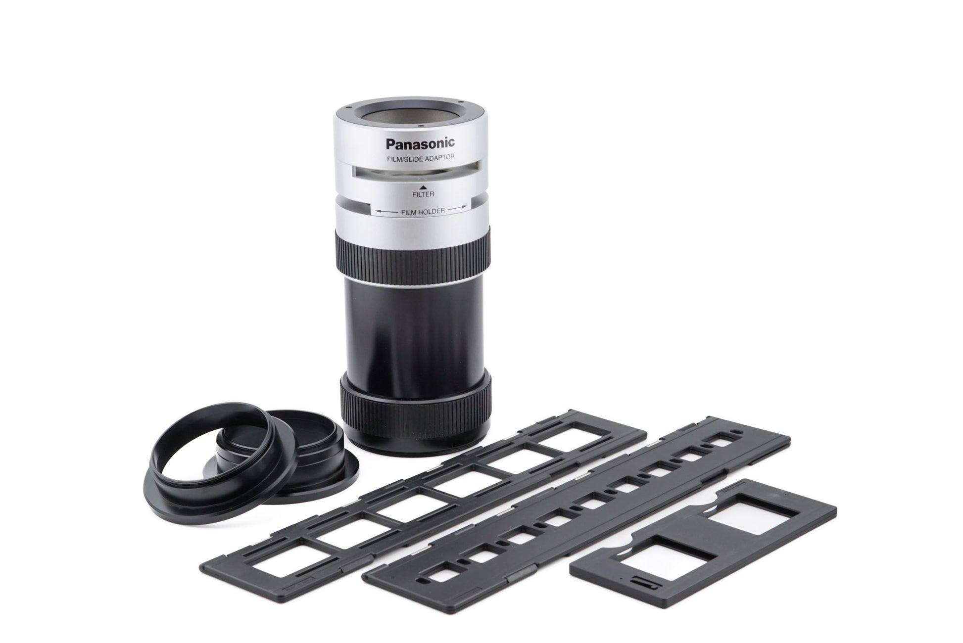 Film/side copy adapter made by Panasonic. Screws onto the filter thread of the lens. Metal body available in grey/black.