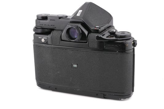 Manual focus 6x7 mount 120 SLR camera released by Pentax in 1989. This was the second iteration of the 6x7 camera, and a few internal features were changed. This includes changes to the shutter and meter coupling mechanisms. Always remove the lens when installing/removing the prism on this model as improper handling can permanently damage the meter coupling mechanism. Metal and plastic body available in black.