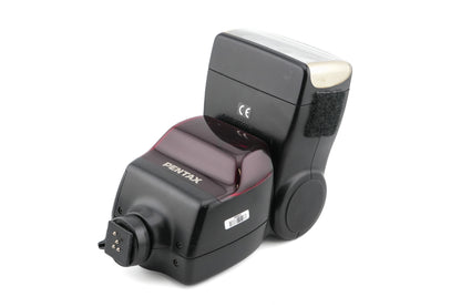 Automatic TTL flash for autofocus Pentax 35mm SLR cameras. Features of the flash include a zooming flash head with tilt and swivel. Plastic body available in black.