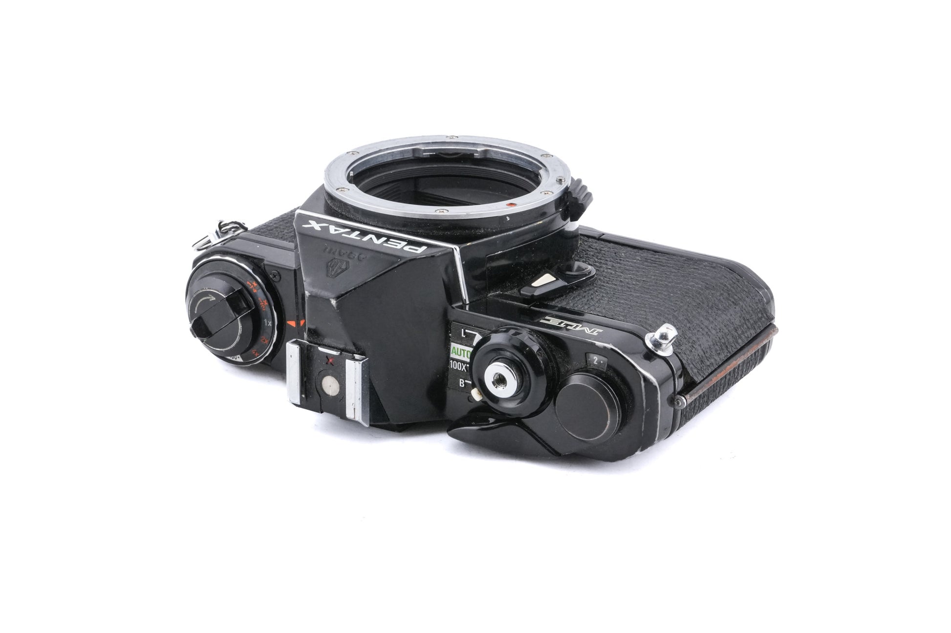 Manual focus K-mount 35mm SLR camera released by Pentax in 1976. It added aperture-priority auto-exposure to the then-popular compact SLR design introduced by the Olympus OM-1. Metal body available in black & silver.