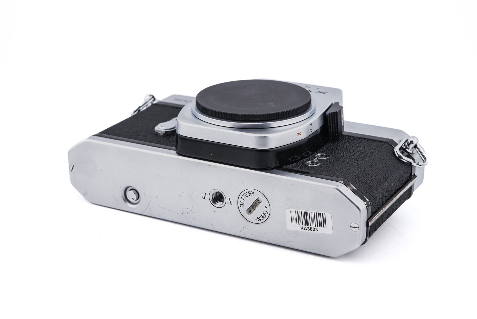 Manual focus M42 mount 35mm SLR released by Pentax. The light meter is tuned for a 1.35v PX400 mercury battery. Metal body available in silver & black.