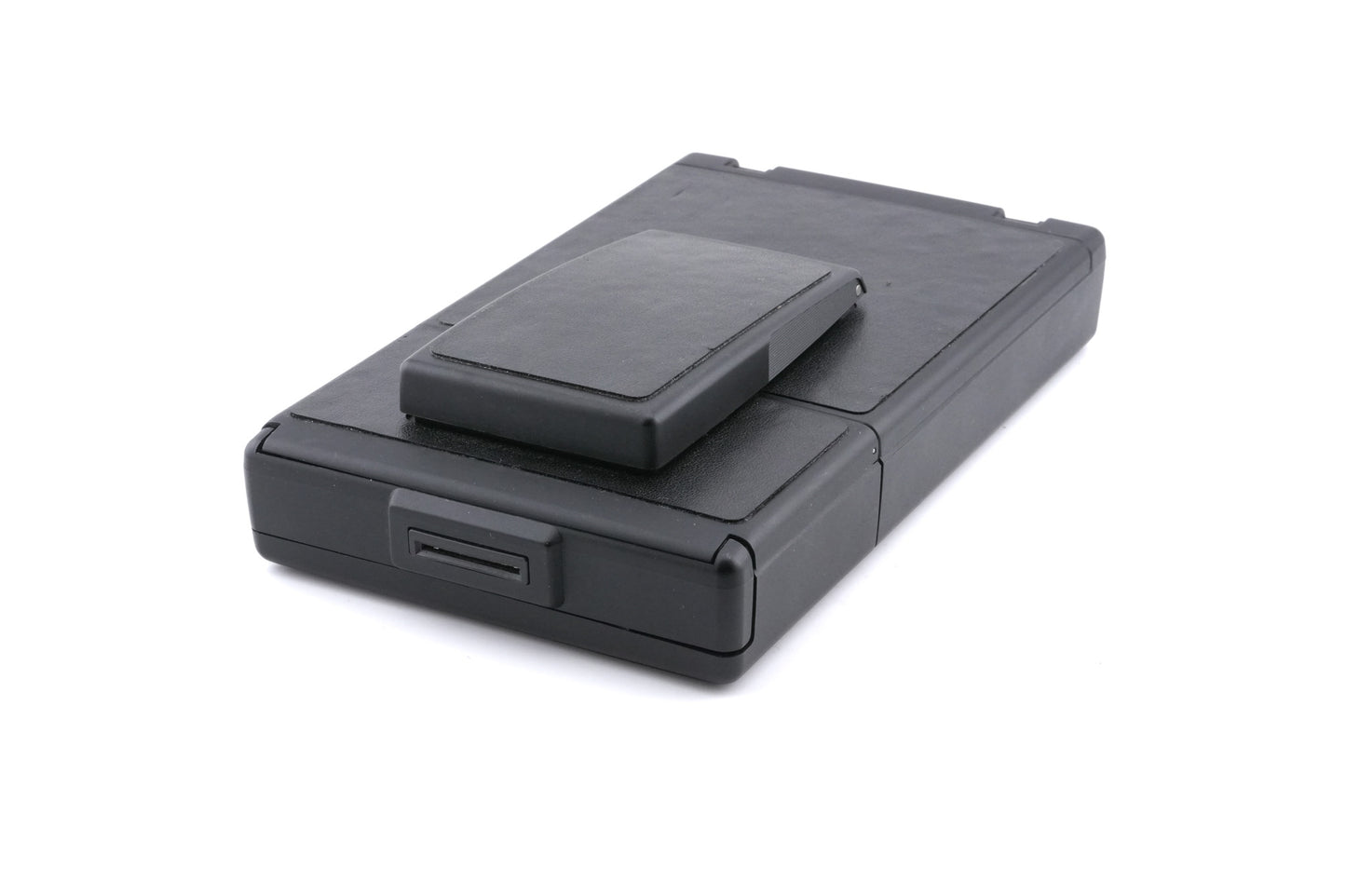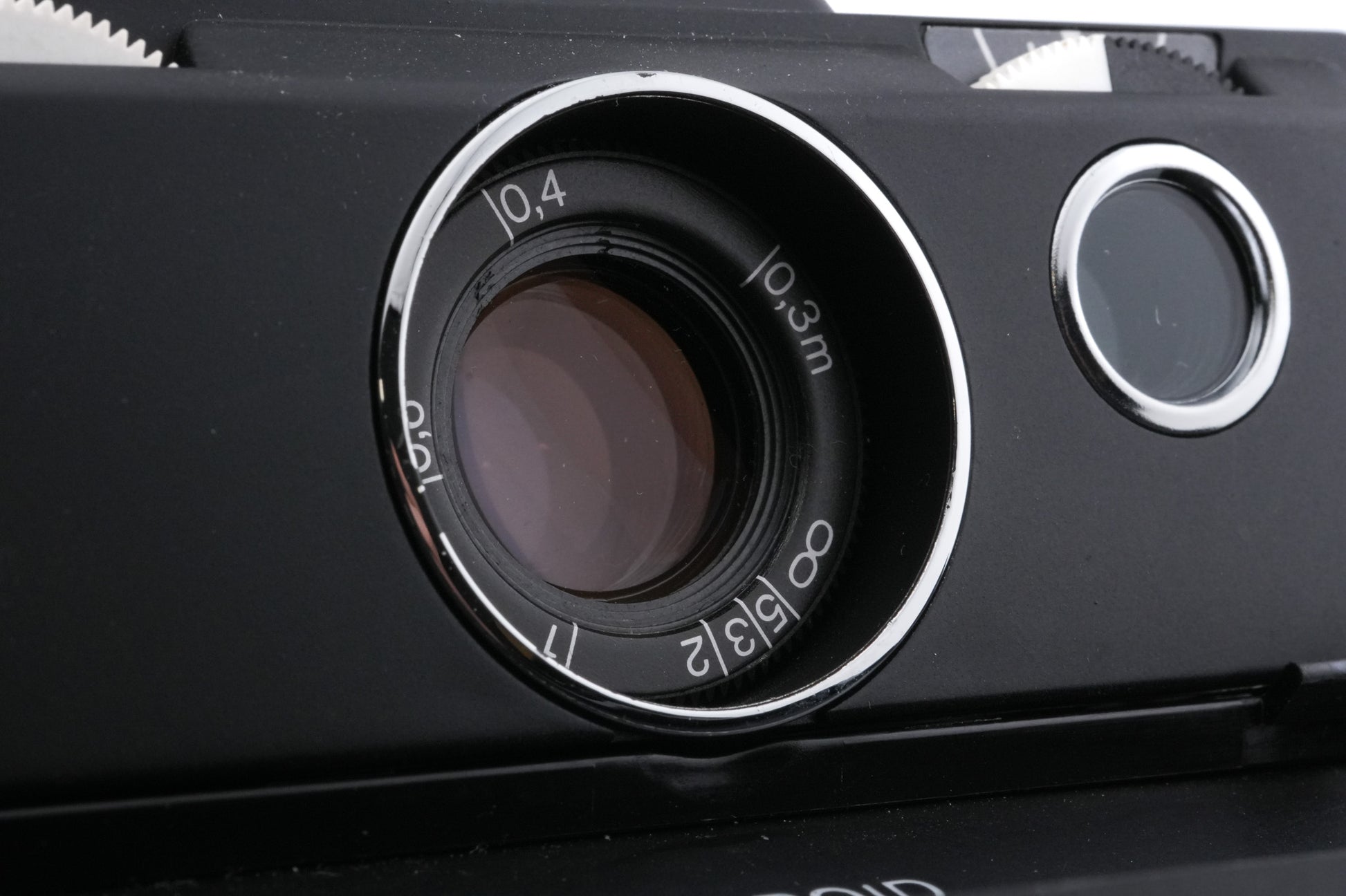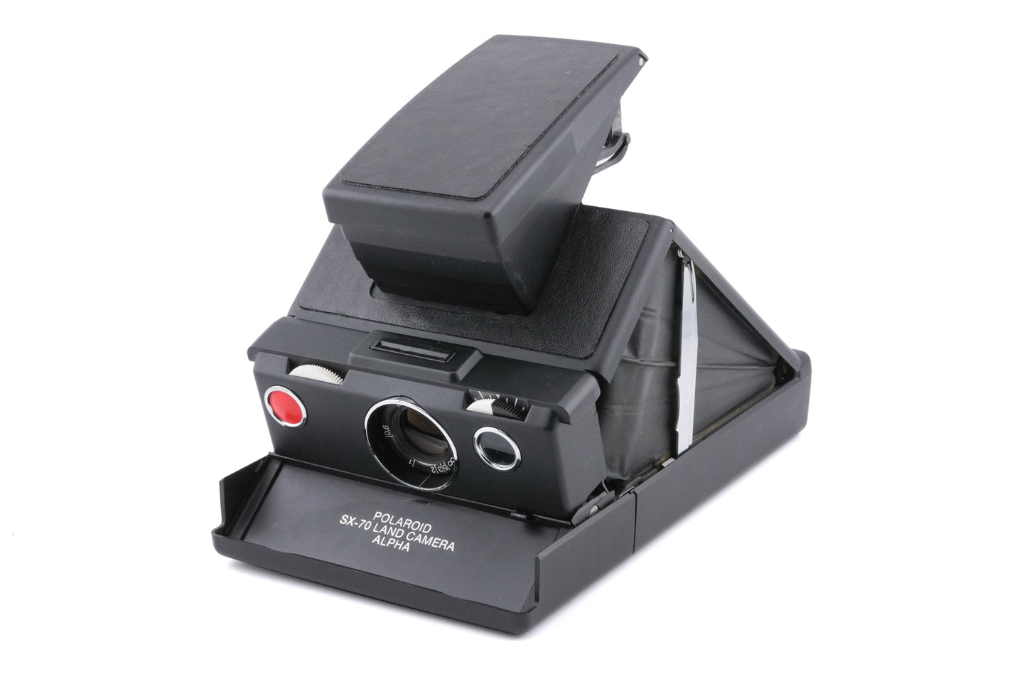 Manual focus SX-70 format camera released by Polaroid in 1977. The Alpha model added strap lugs, a matte paint finish, and a tripod socket to the original SX-70 design. Plastic body available in black.