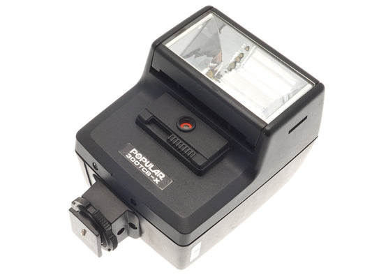 Flash made by Popular. The flash head tilts 90º. Has one contact pin, so can be used in manual flash mode.