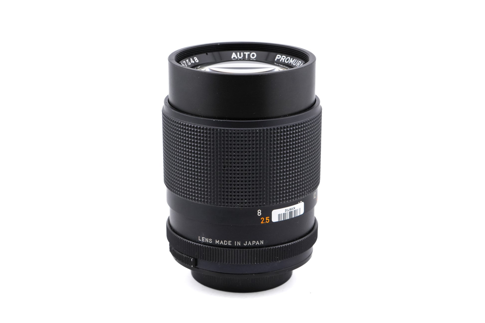 Manual focus telephoto lens made for Canon FD 35mm SLRs by Promura. Metal body available in black.