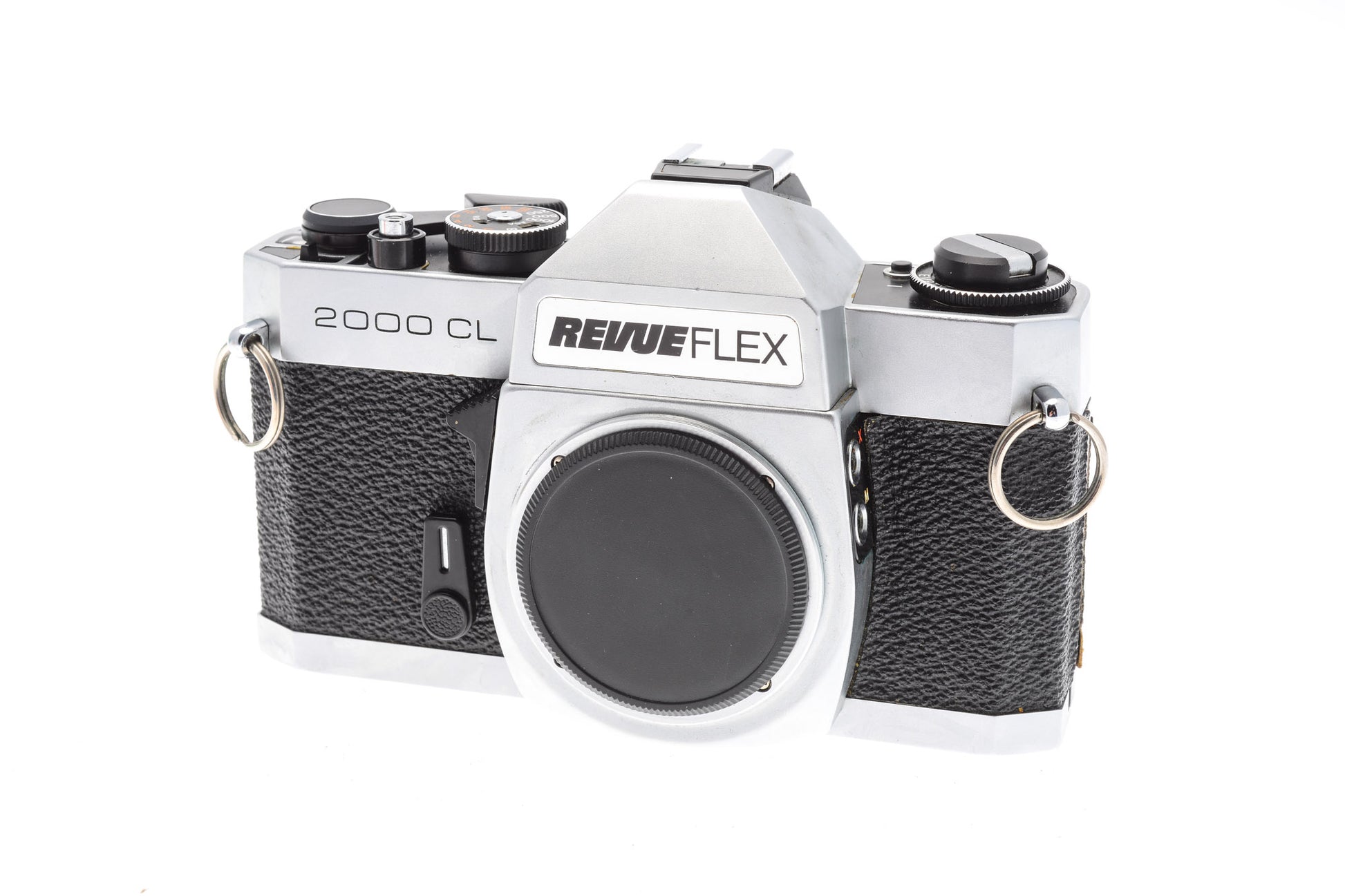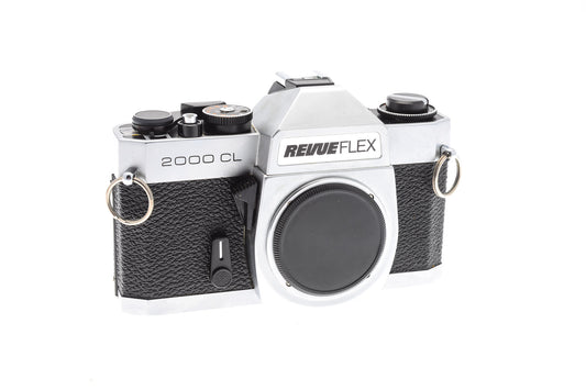 Manual focus M42-mount 35mm SLR camera released by Revue. The camera is actually a Chinon CX rebadged as Revueflex 2000 CL for the German retailer Foto-Quelle. Plastic body available in black & silver.