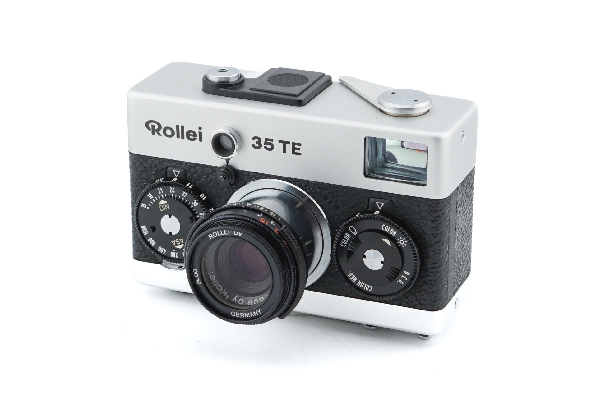 35mm zone focus viewfinder camera released by Rollei in 1979. TE/SE added the exposure information into the finder instead of the top plate like on the original. TE and SE are otherwise identical, but TE has the Tessar lens while SE has the Sonnar. Features a CdS exposure meter powered by a PX27 battery. Metal body available in satin chrome and black finishes.
