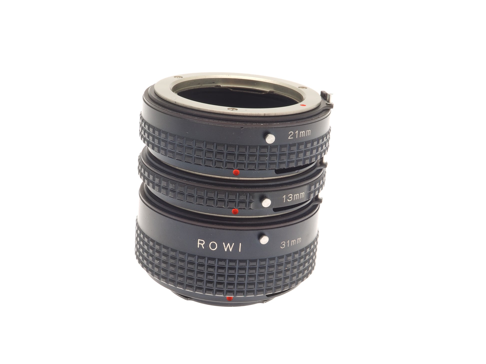Three piece extension tube set for Minolta MD-mount cameras and lenses. 13mm, 21mm and 31mm tubes.