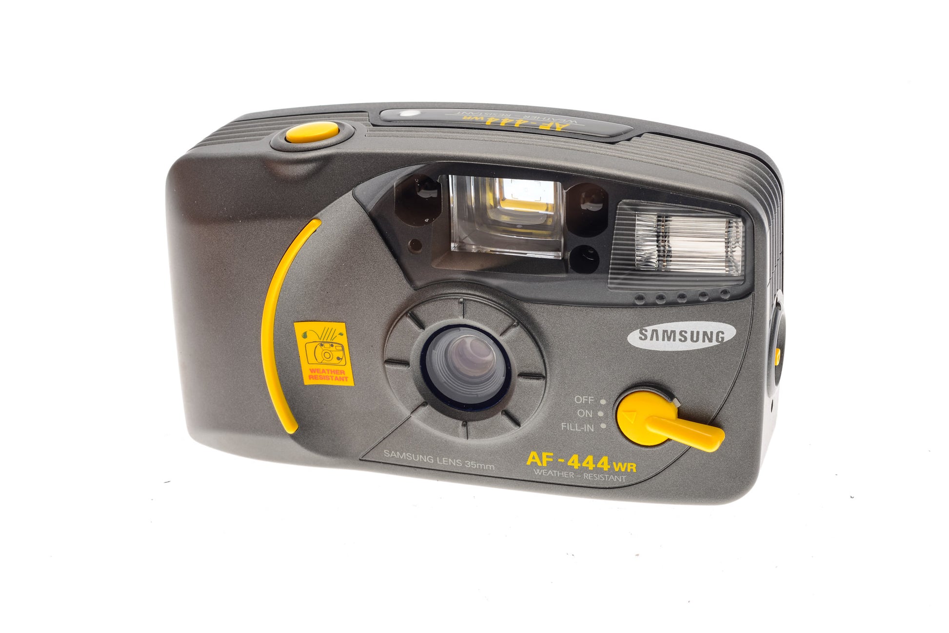 35mm autofocus point & shoot camera released by Samsung. It was sold with or without a date back. Plastic body available in black with yellow accents.