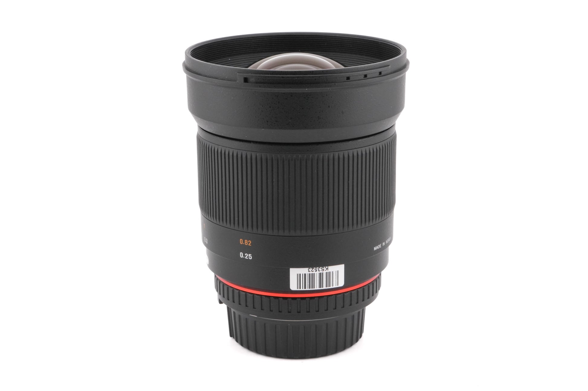 Manual focus wide-angle lens for F-mount DSLR cameras introduced by Samyang. Metal and plastic body available in black.