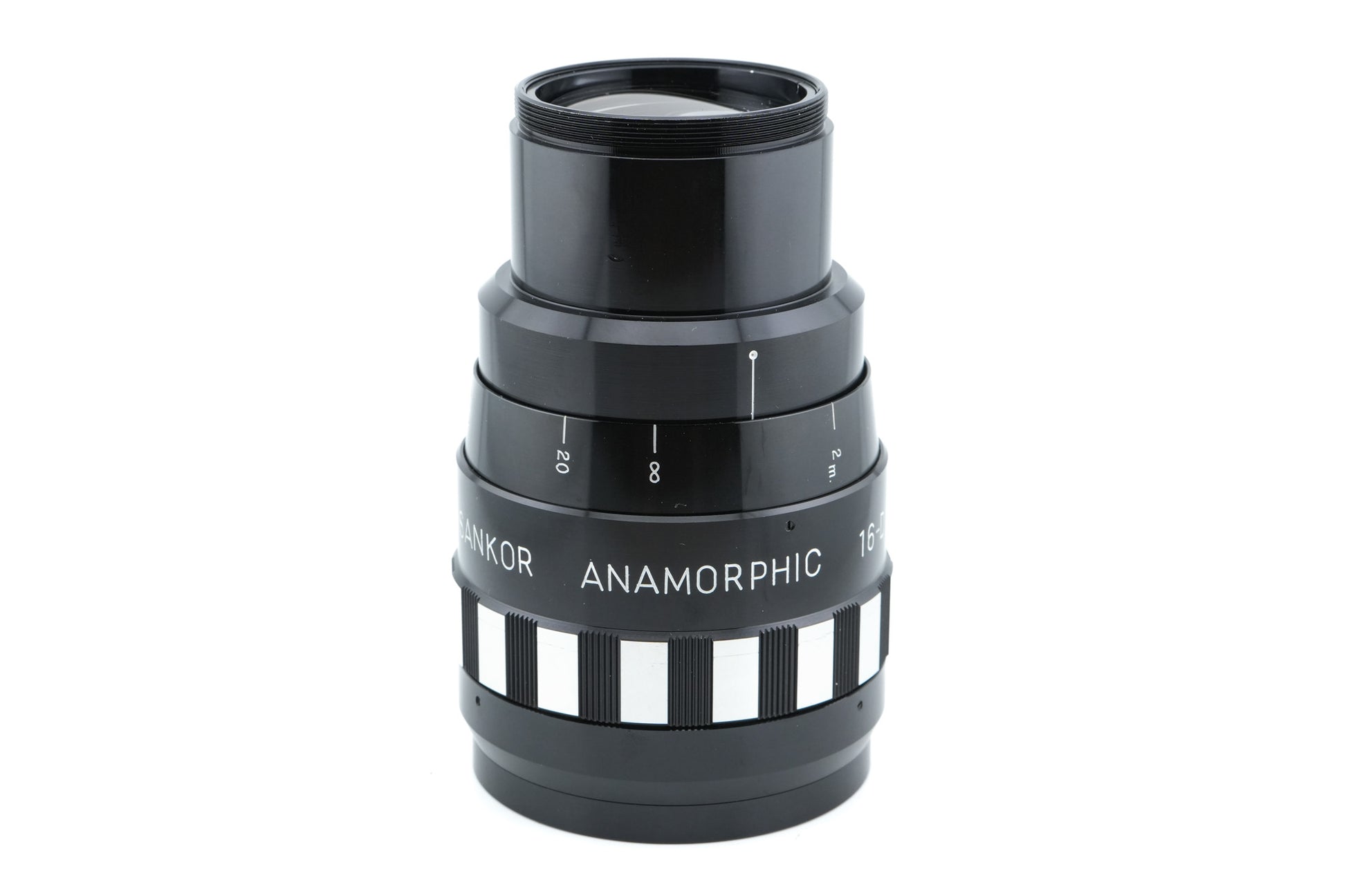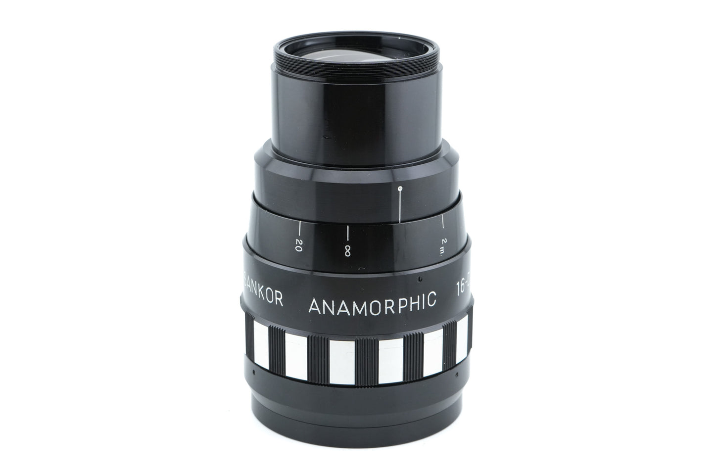 Manual focus anamorphic lens with 50mm rear thread made by Sankor. No aperture mechanism. Metal body in black finish with a zebra-colored focus ring.