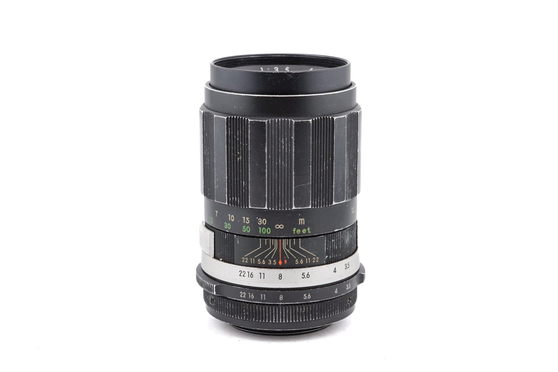 Manual focus telephoto lens made for M42 screw mount SLR cameras by Soligor. It has a set aperture. Metal body available in black.
