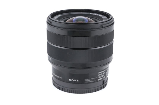 Autofocus wide-angle zoom lens made for E-mount digital mirrorless cameras by Sony. It is designed for APS-C-sized sensors and gives the equivalent field of view to a 15-27mm lens on full frame/35mm. It has an image stabilizer (OSS). The product code is SEL1018. Metal/plastic body available in black.