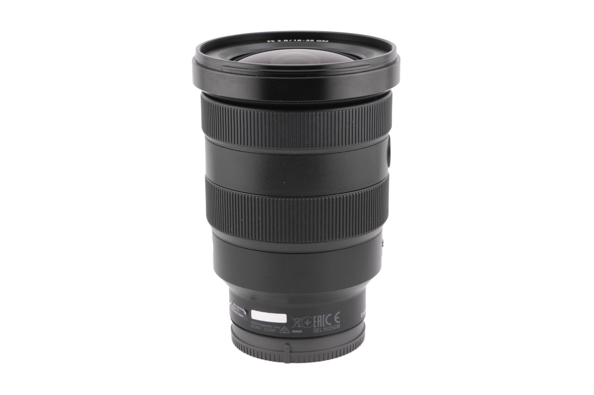 Autofocus wide angle zoom lens made for E/FE mount digital mirrorless cameras by Sony. It is part of their G Master line of professional lenses and features a weather-sealing gasket. The product code is SEL1635GM. Metal body available in black.