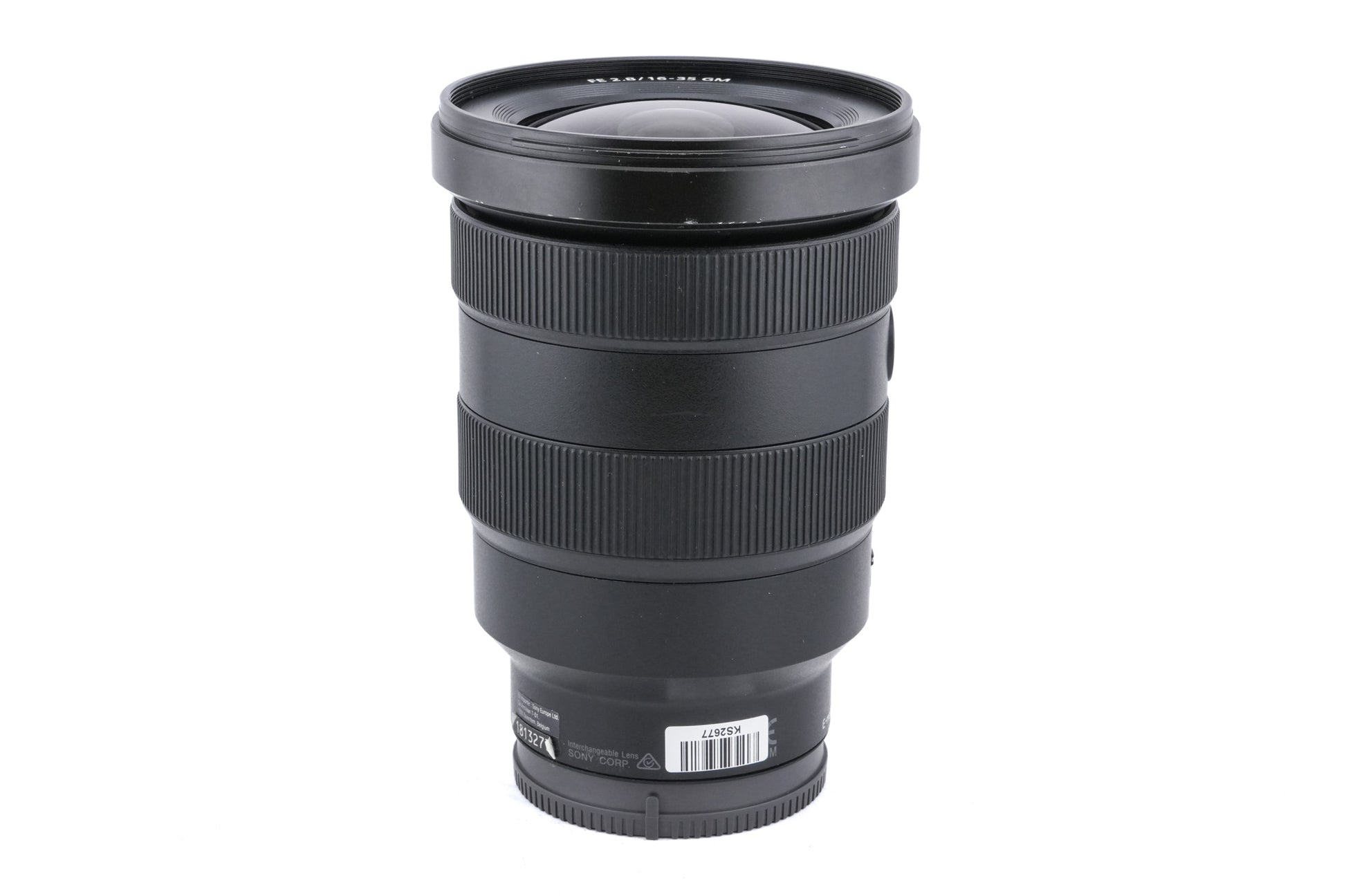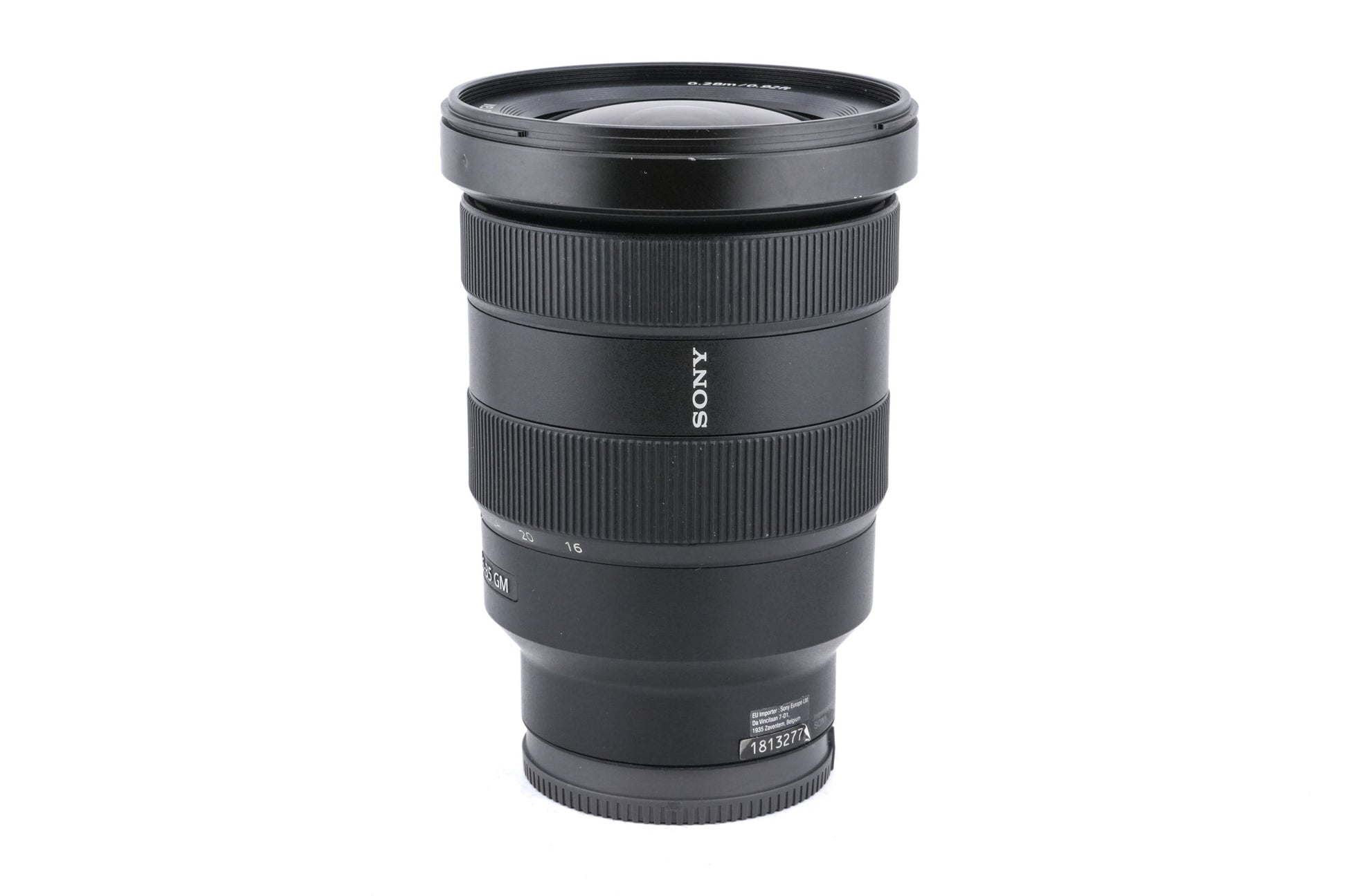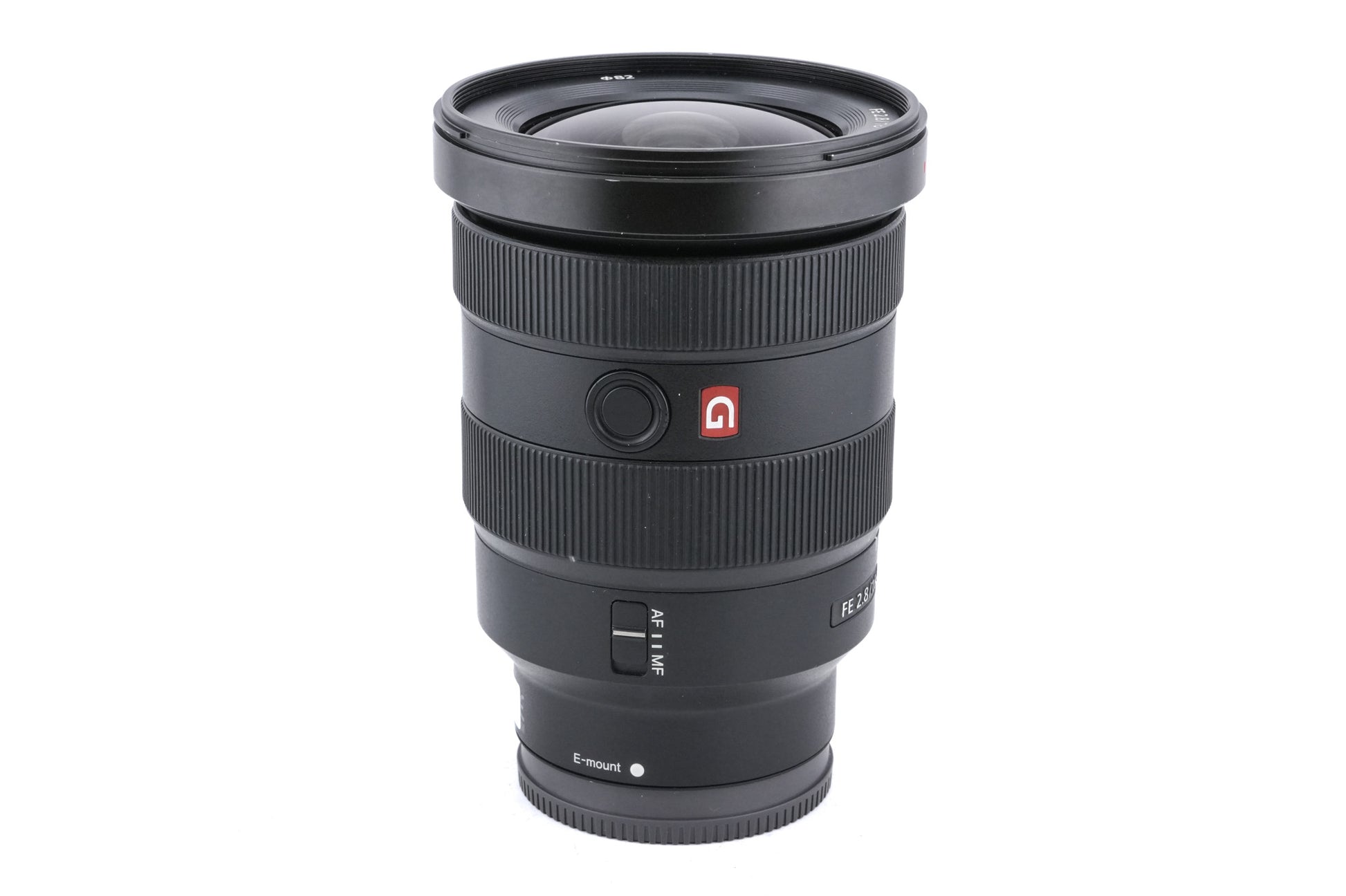 Autofocus wide angle zoom lens made for E/FE mount digital mirrorless cameras by Sony. It is part of their G Master line of professional lenses and features a weather-sealing gasket. The product code is SEL1635GM. Metal body available in black.