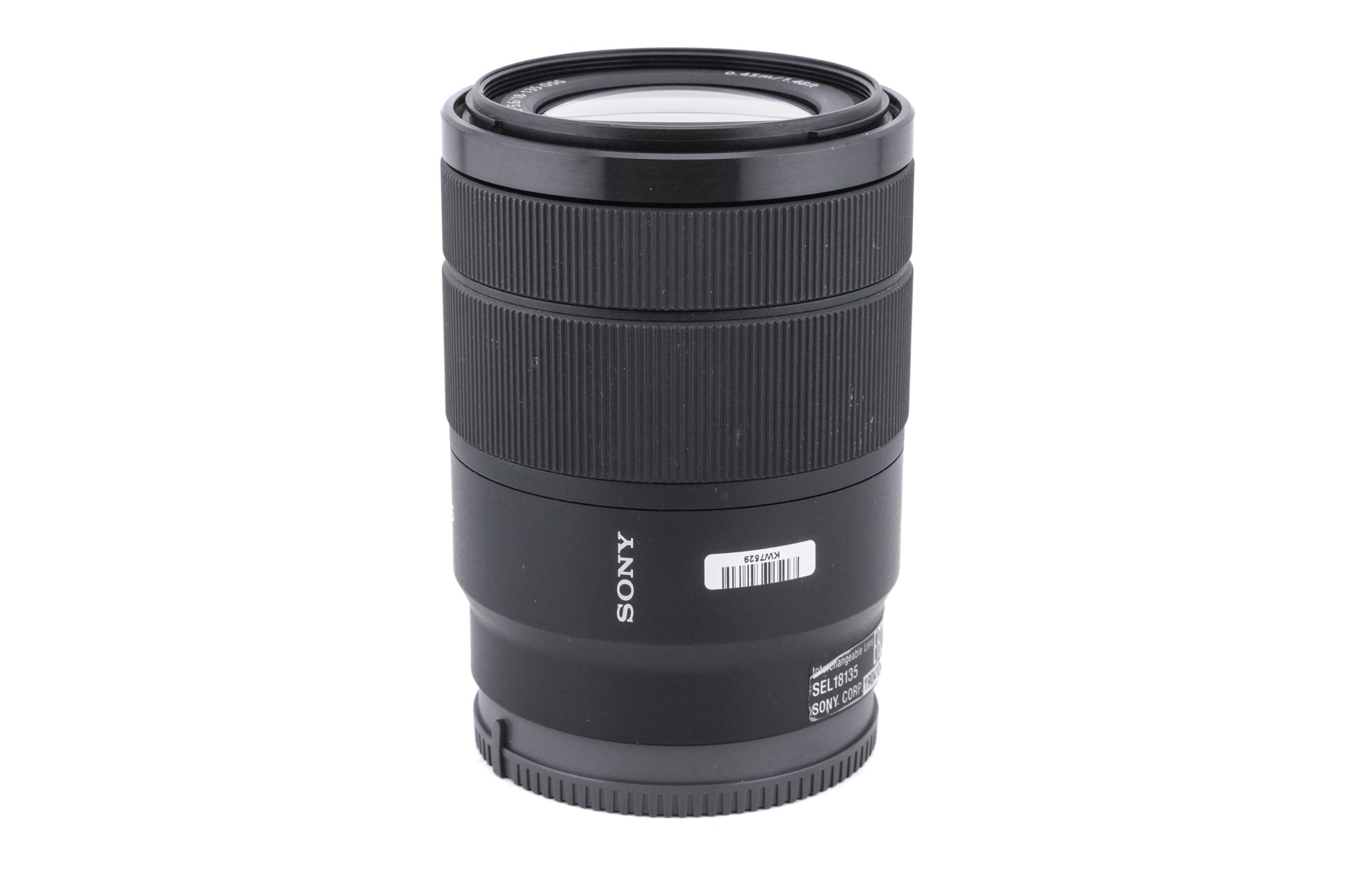 Autofocus superzoom lens made for E-mount digital mirrorless cameras by Sony. It is designed for APS-C-sized sensors and gives the equivalent field of view to a 27-202.5mm lens on full frame/35mm. It has image stabilization (OSS). The product code is SEL18135. Plastic body available in black.