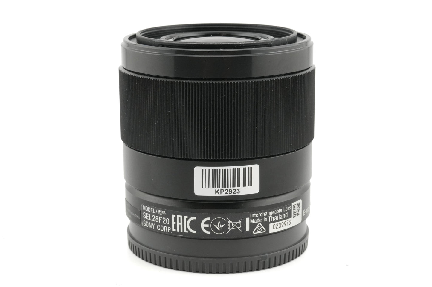Autofocus wide-angle lens made for E-mount digital mirrorless cameras by Sony. It has an internal focus mechanism with a near-silent linear focusing motor. The product code is SEL28F20. Metal and plastic body available in black.
