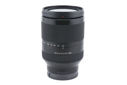 Autofocus telephoto zoom lens made for FE-mount digital mirrorless cameras introduced by Sony in 2021. It features optical image stabilization (OSS), weather sealing, a built-in tripod collar, and switches for AF/MF, aperture clicking, DMF, and limiting focus. Metal and plastic body in white.
