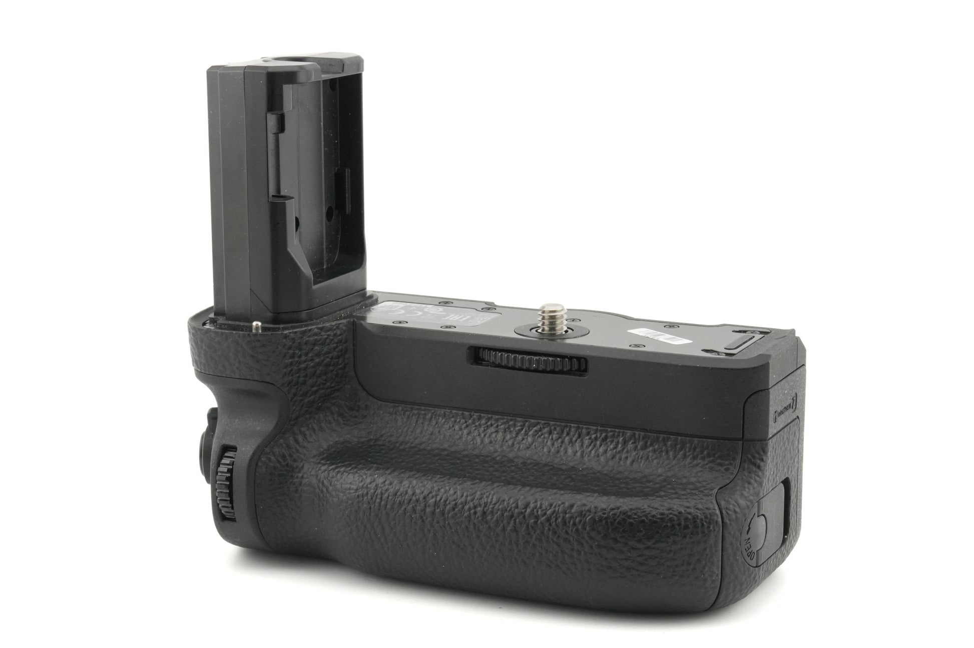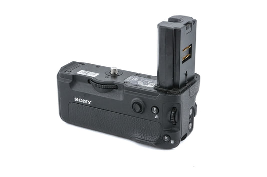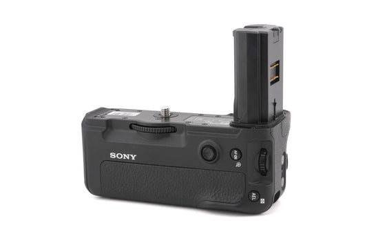 Accessory battery grip for Sony 9, a7 III, and a7R III mirrorless digital cameras. Provides prolonged battery life and added comfort for vertical shooting. Features include rear buttons, two control dials, and a shutter button. Plastic body available in black.