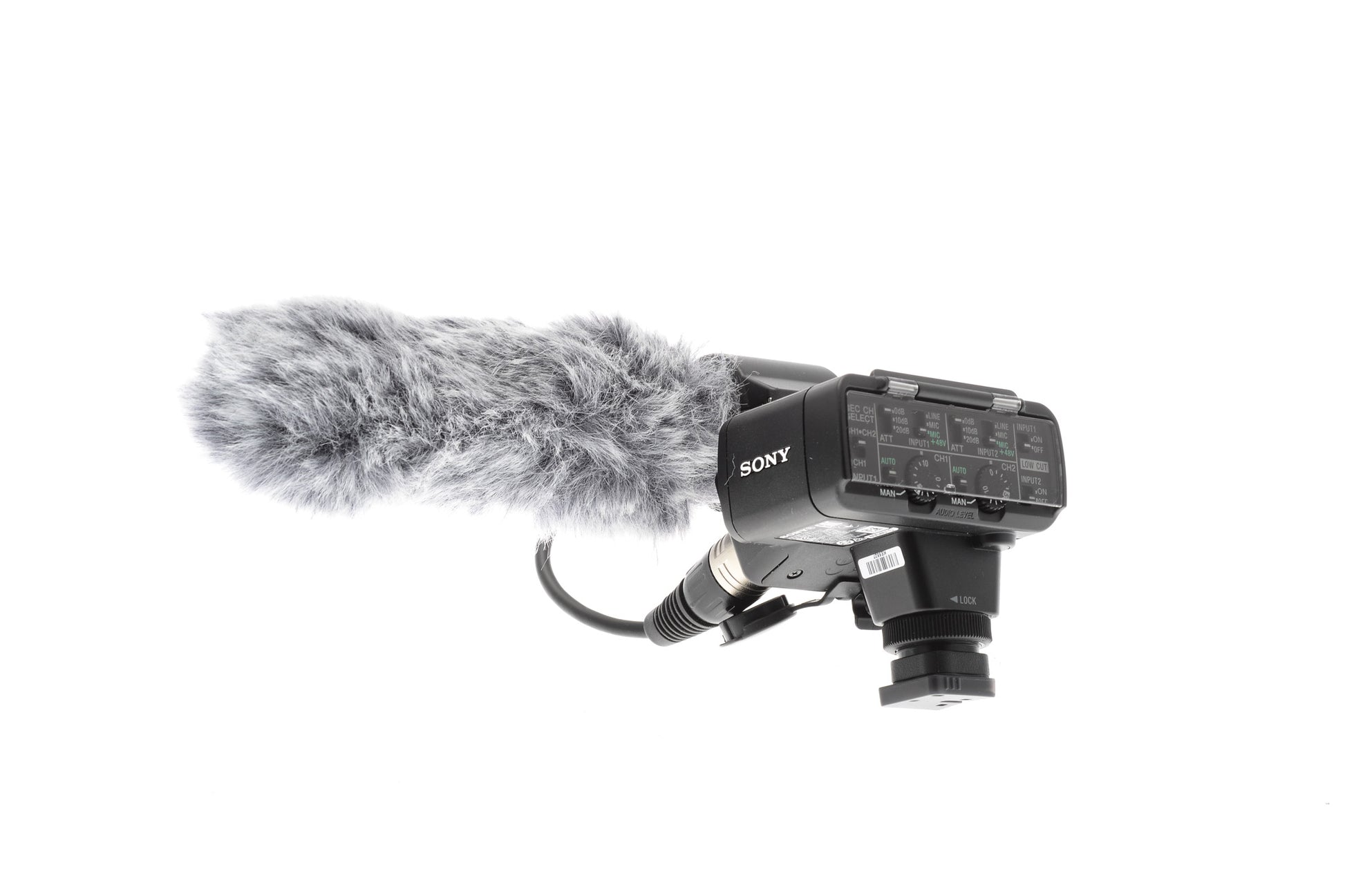 2-channel XLR-adapter with audio level controls for Sony a7 and RX series digital cameras. Includes Sony ECM-XM1 shotgun microphone and dead cat.