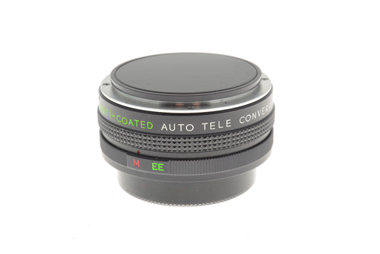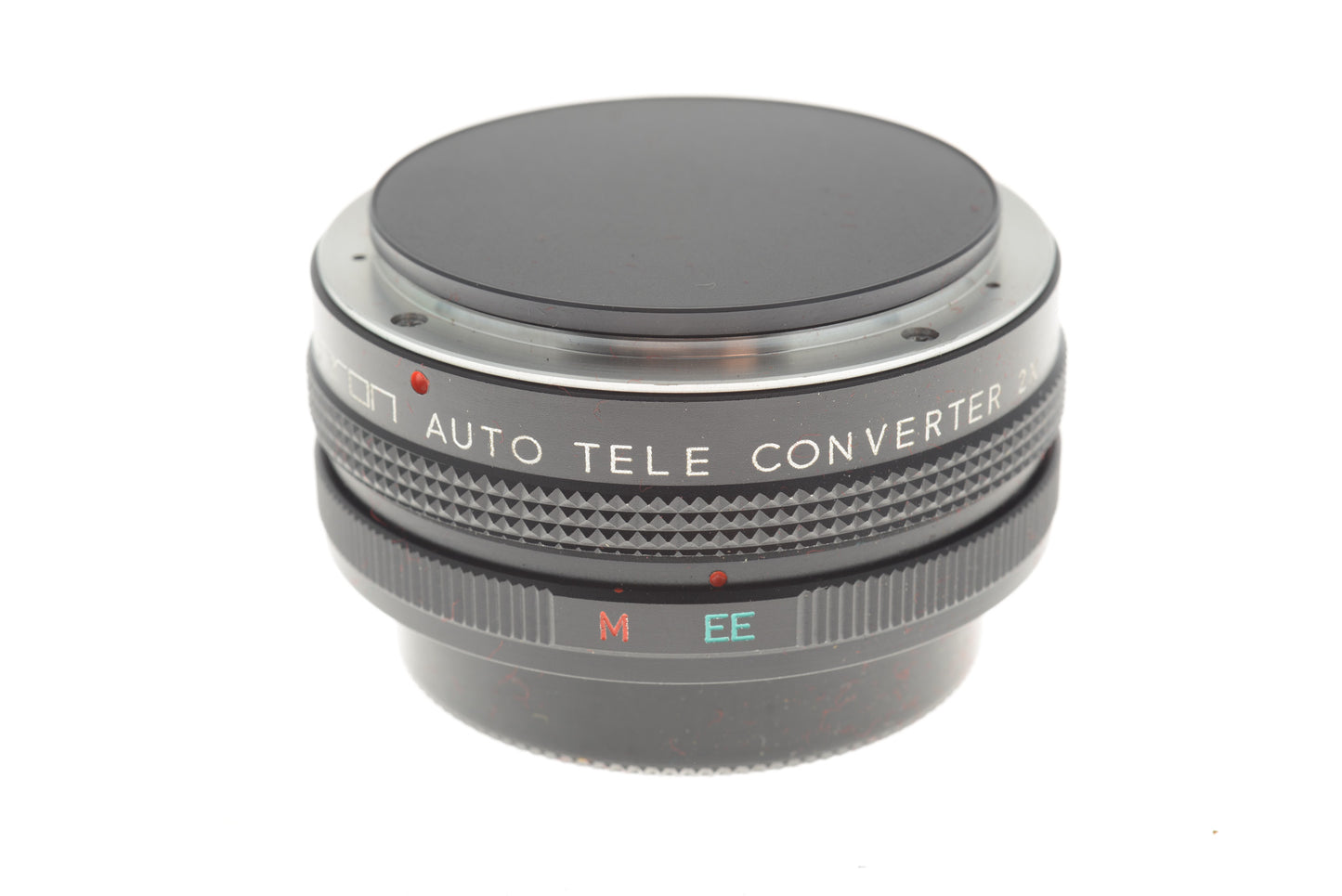 Multiplies focal length by two. Reduces lens' speed by two stops.