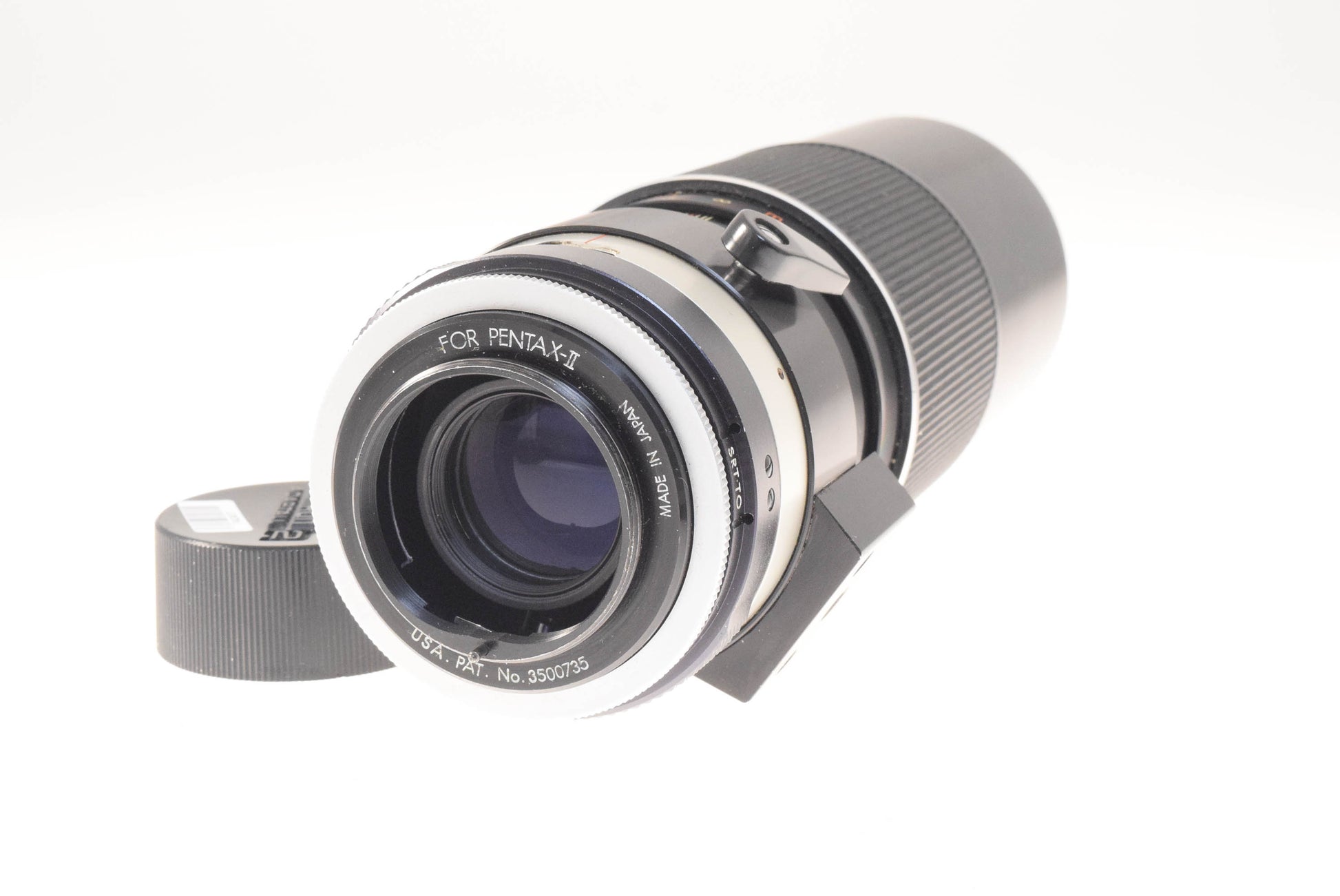 Manual focus telephoto lens made for M42 by Tamron. Can be used with most popular mounts with the right adapter. Has a built-in tripod screw and lens hood. Metal/plastic body available in black.