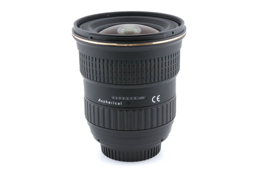 Autofocus wide-angle zoom lens made for Nikon F mount DSLR cameras by Tokina. Metal and plastic construction in black finish.