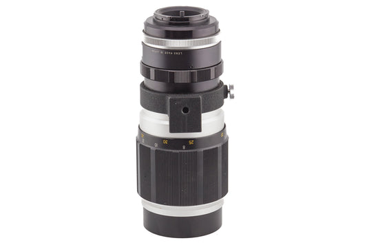 Manual focus telephoto prime lens for the T4 modular mount system made by Tokina. Integrated rotatable tripod mount ring. Metal body in black and silver finish.