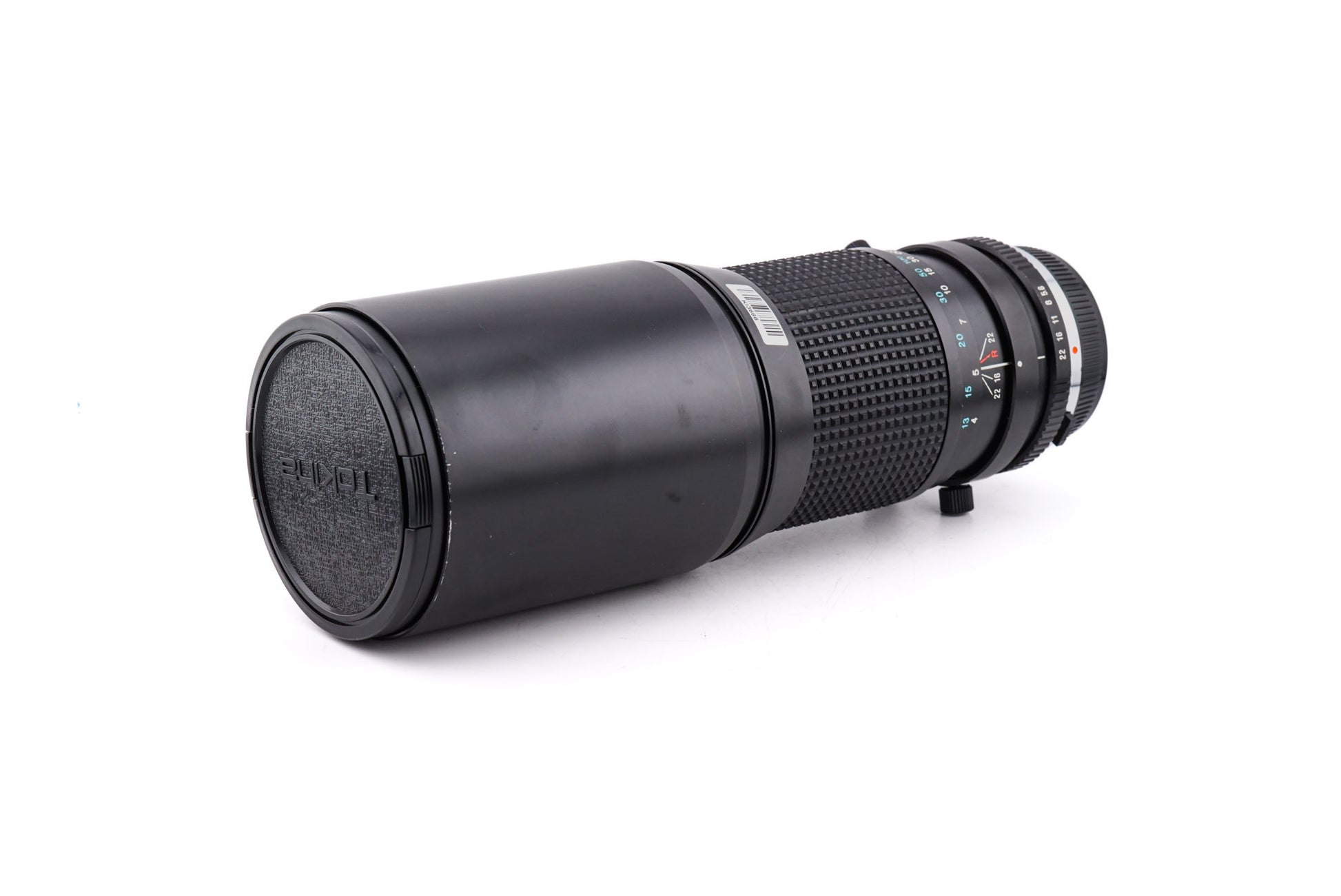Manual focus telephoto lens made for Olympus OM mount 35mm SLRs by Tokina. Has a built-in lens hood and tripod mount. Metal body available in black.