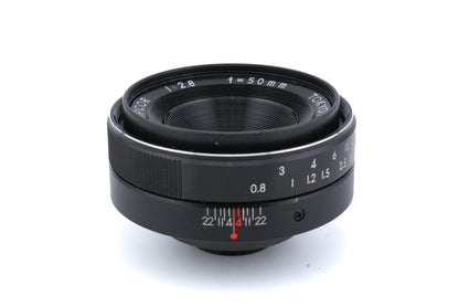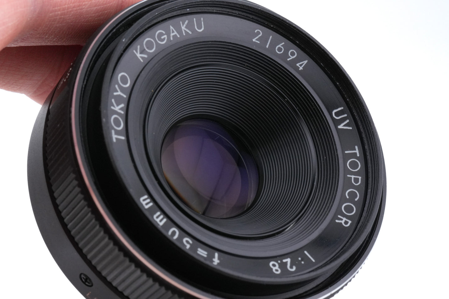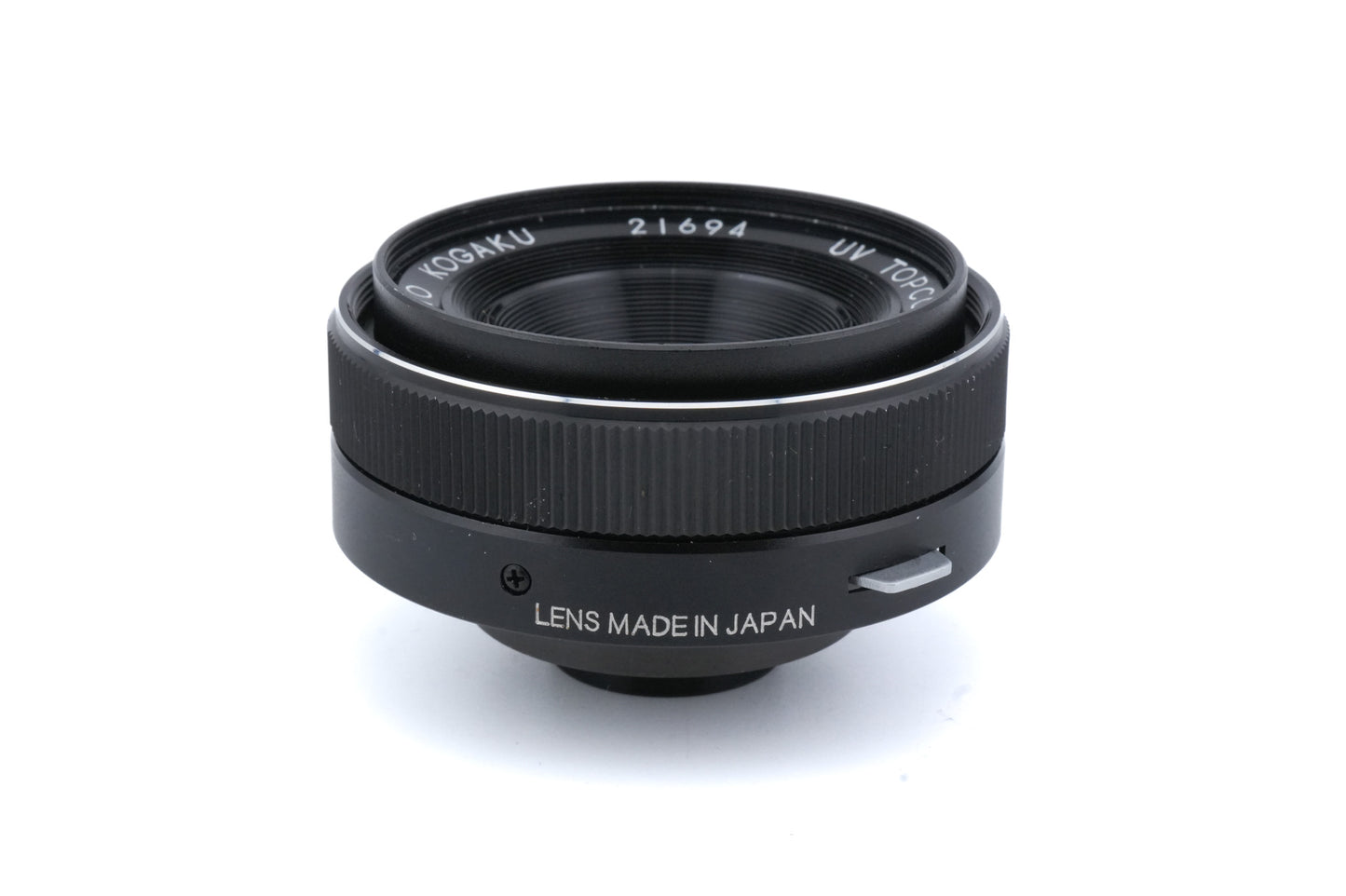 Manual focus normal lens for Topcon UV mount SLR cameras. This mount was used in Wink Mirror S, 100 Auto, Uni, Unirex and IC-1 Auto. A distinctive feature of the lens is the lack of aperture setting as this is dialed in on the cameras. Black metal body.