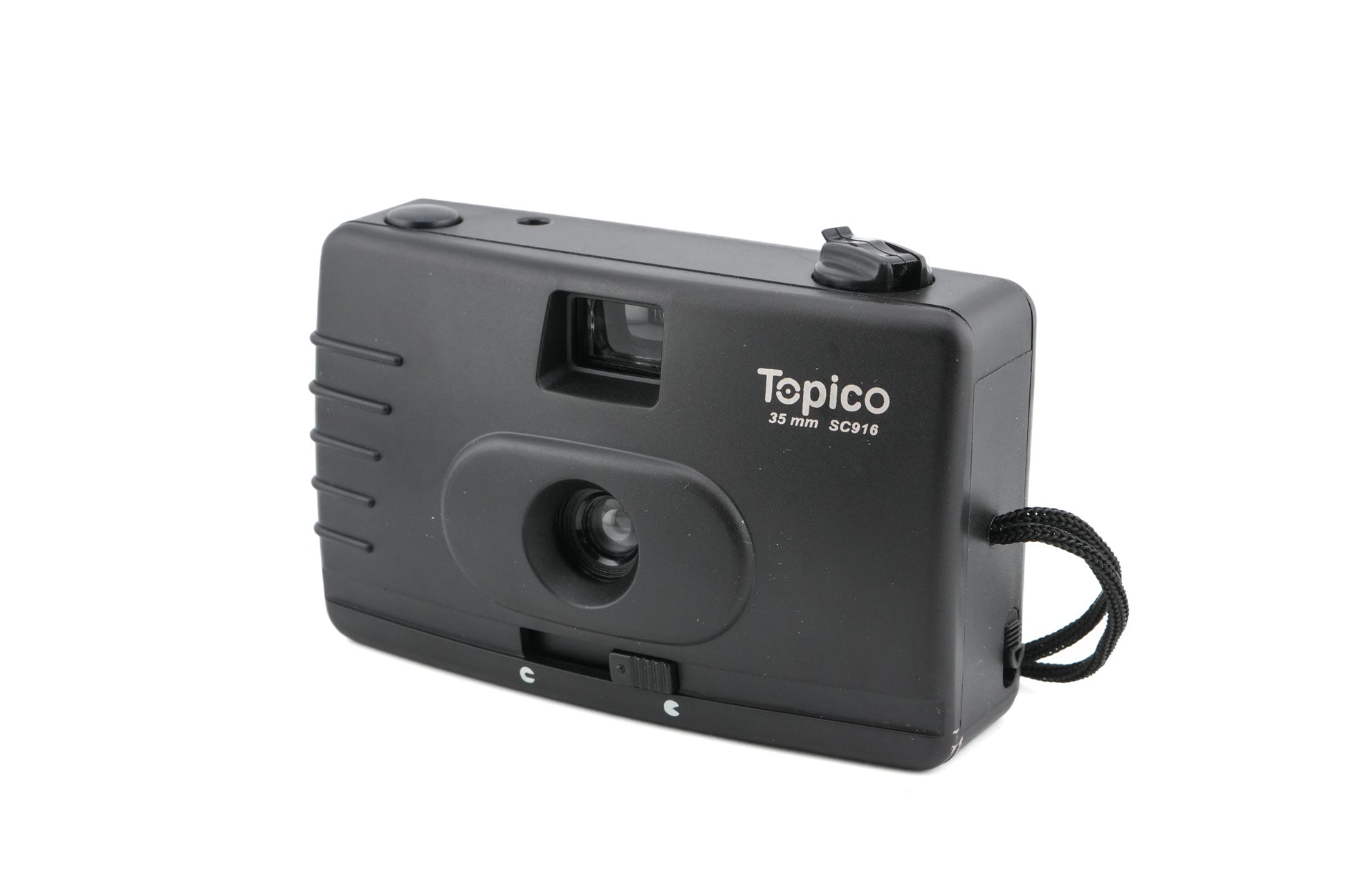 Fixed focus 35mm point-and-shoot camera made by Topico. Plastic construction available in black.