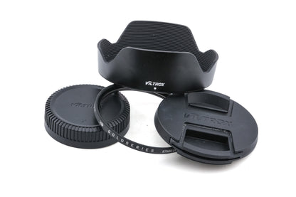 Autofocus wide-angle lens made for X-mount digital mirrorless cameras by Viltrox. It is designed for APS-C-sized sensors and gives the equivalent field of view to a 19.5mm lens on full frame/35mm. Metal body available in black.