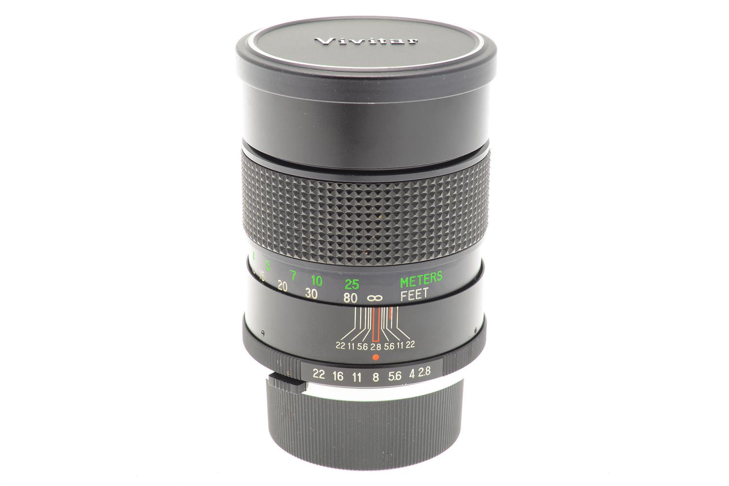 Manual focus telephoto prime lens for the Olympus OM-mount SLRs sold by Vivitar. Originally made by Comine, and comes with a retractable lens hood. Earlier versions have metal grips and 5 element designs, and later ones have rubber grips and 4 element designs. Metal body available in black.