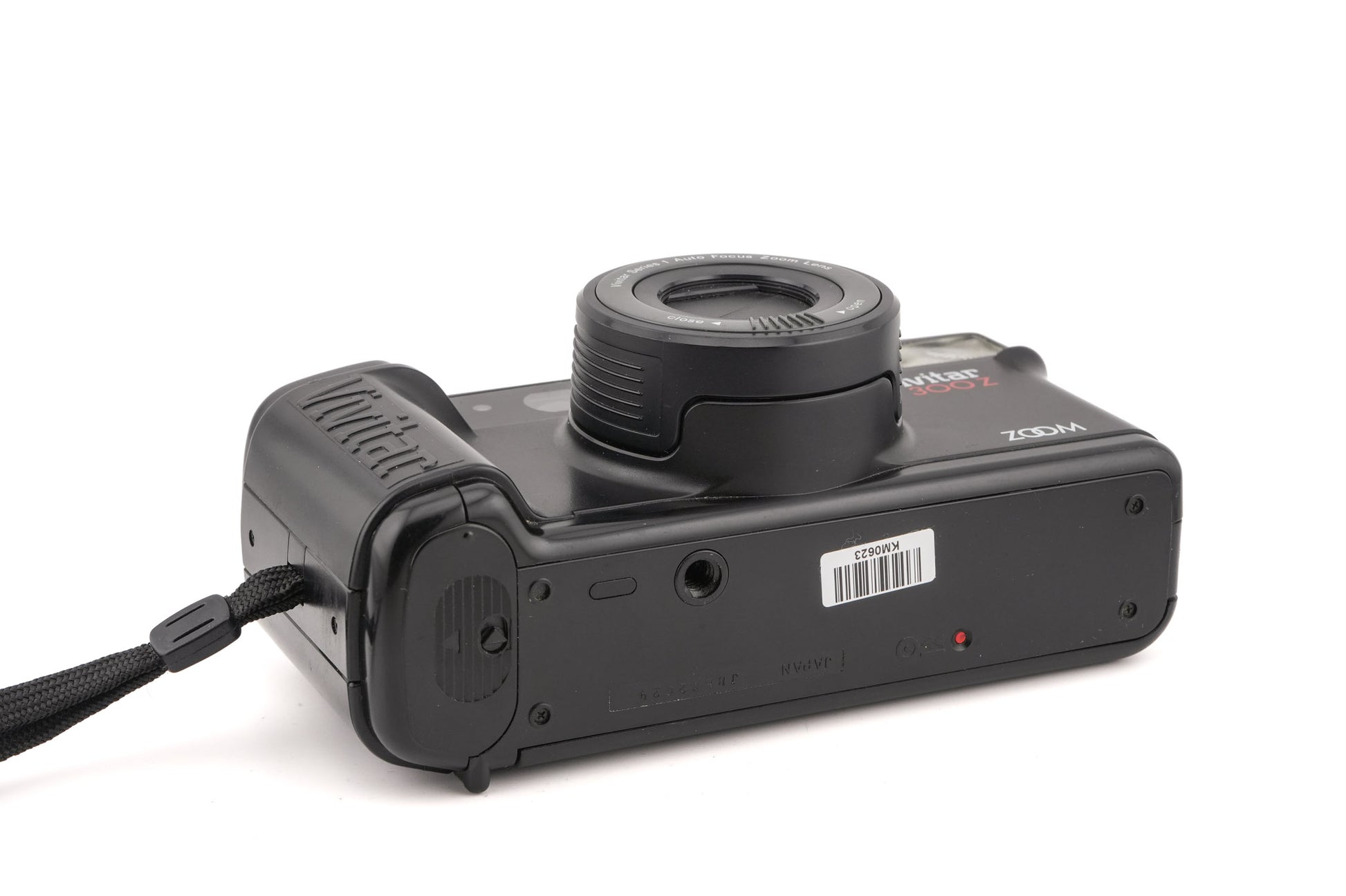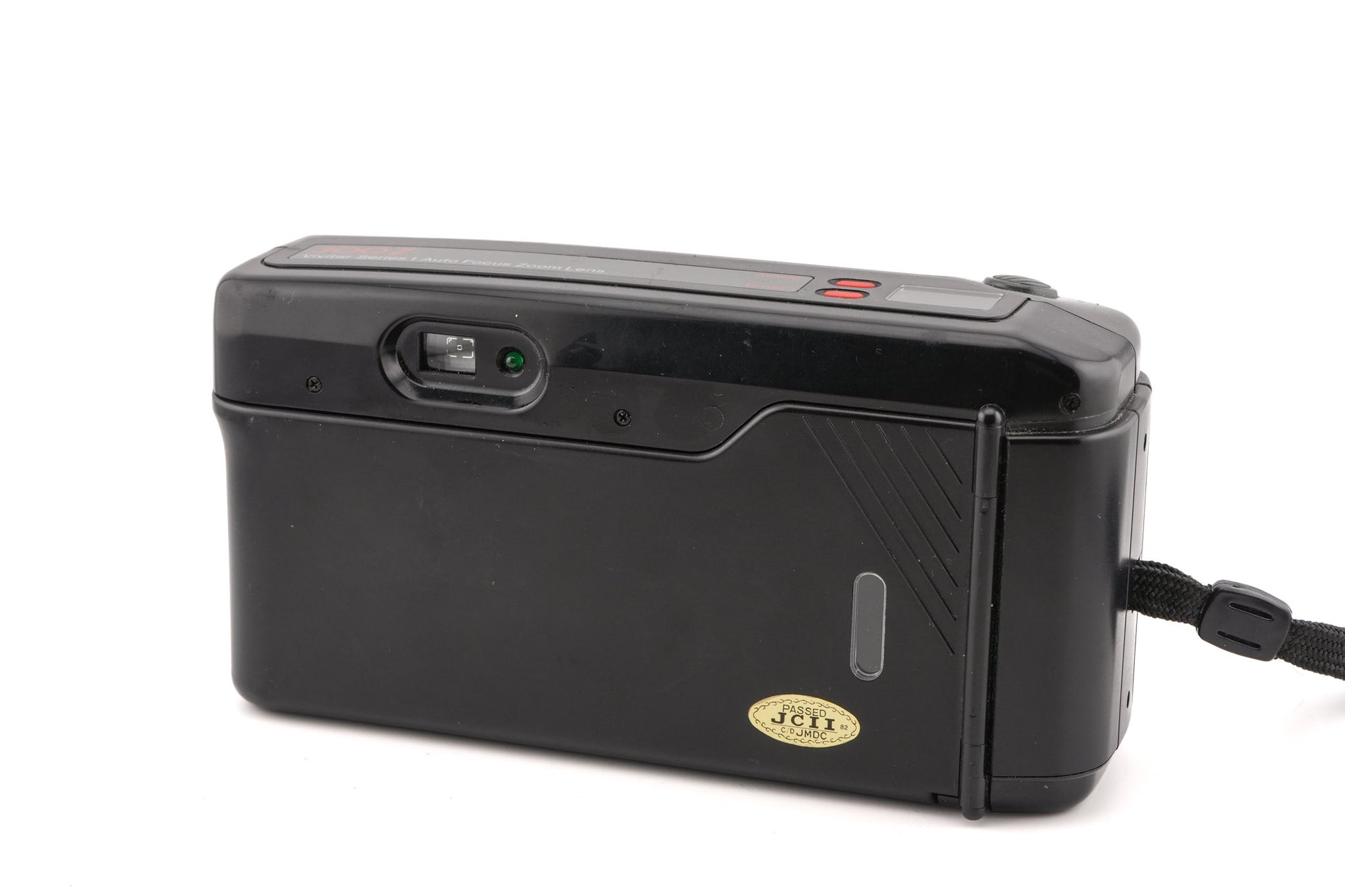 Autofocus 35mm point & shoot camera released by Vivitar. It has a push/pull zoom, a built-in lens cover, and a flash. Plastic body available in black.