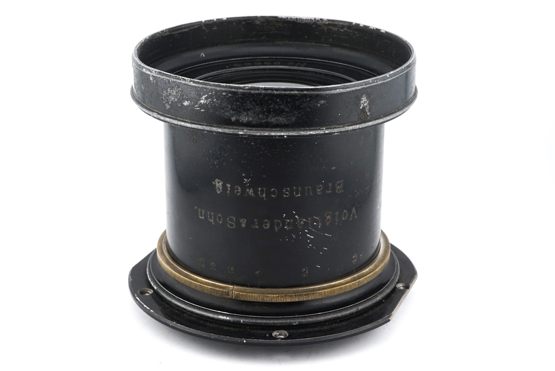 Large format lens made by Voigtländer & Sohn. It has an aperture mechanism built in. Brass body available in black.