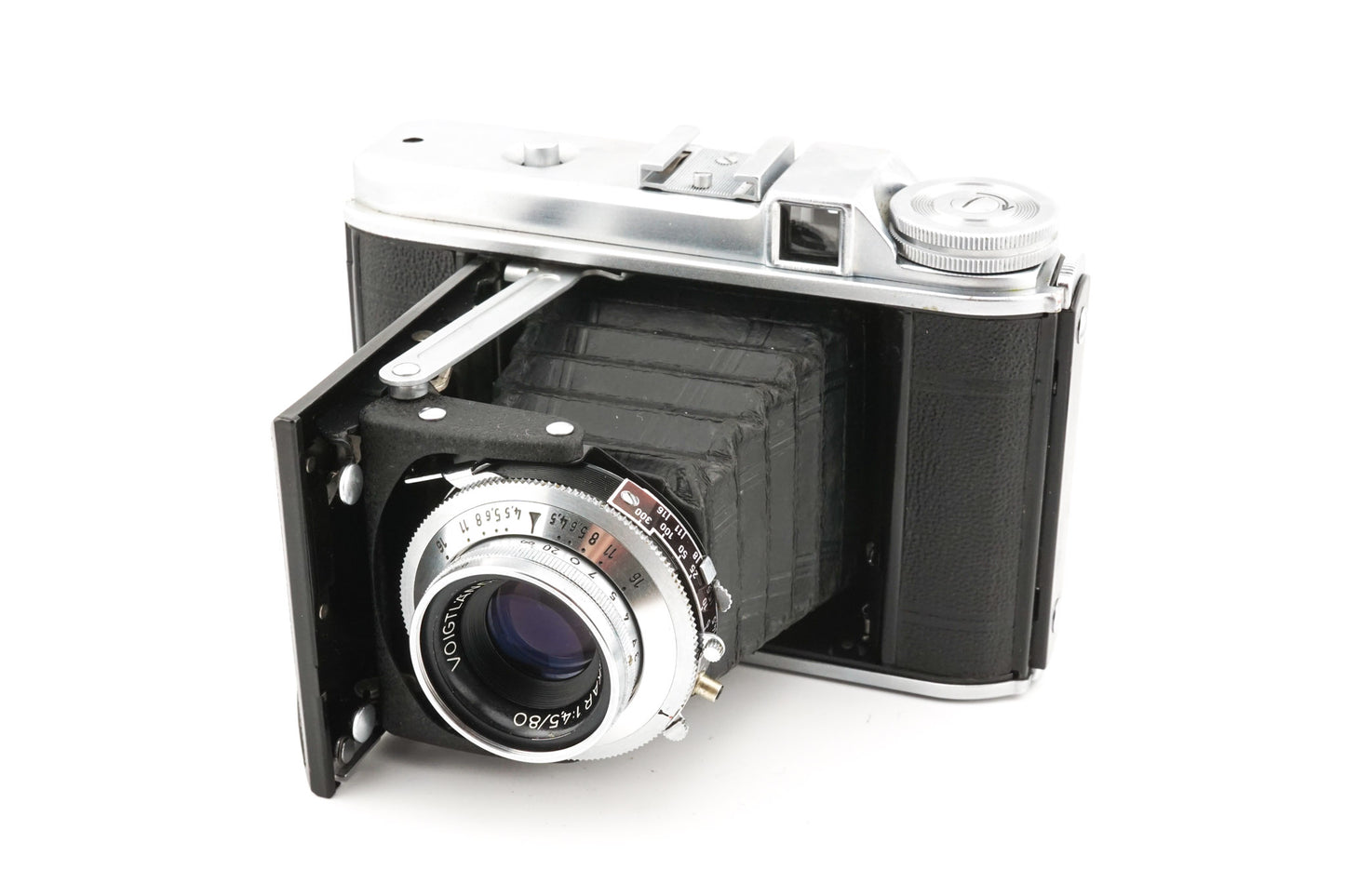 Manual focus 120 folding camera released by Voigtländer in 1950. Features no focusing aid. Metal body available in silver.