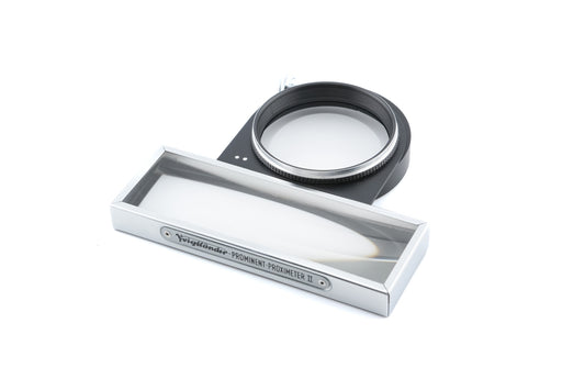 Close up lens with a glass element for the viewfinder compensation as well. Made for the Voigtländer Prominent system lenses that have a outer lens barrel end diameter of ~47mm. Metal body available in silver/black.